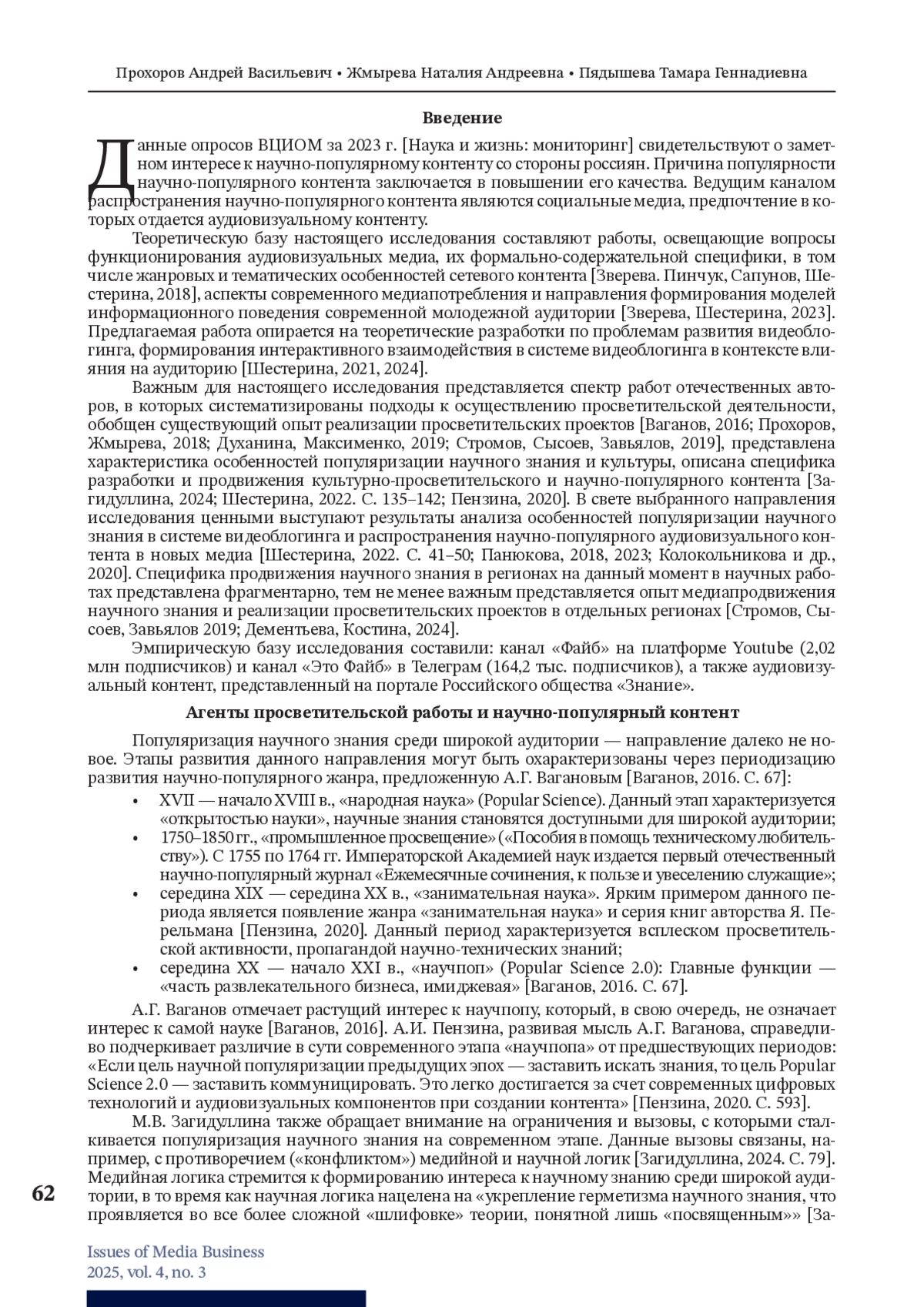 5. Загидуллина М.В. Популяризация и наука: о конфликте институциональных логик // Медиасреда. 2024. № 2. С. 76-79.