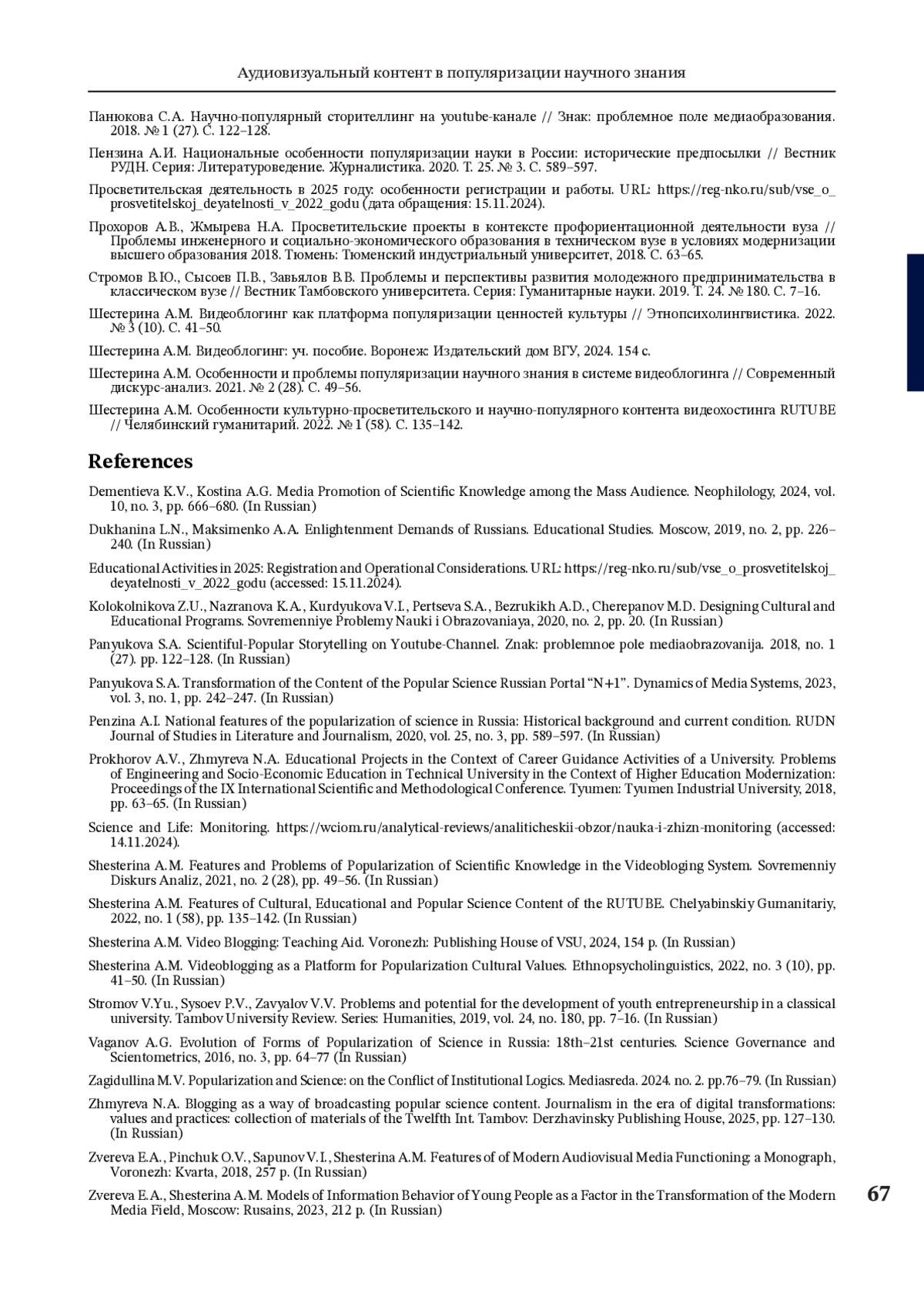 4. Жмырева Н.А. Блогинг как способ трансляции научно-популярного контента // Журналистика в эпоху цифровых трансформаций: ценности и практики. Тамбов: Издательский дом “Державинский”, 2025. C. 127-130.