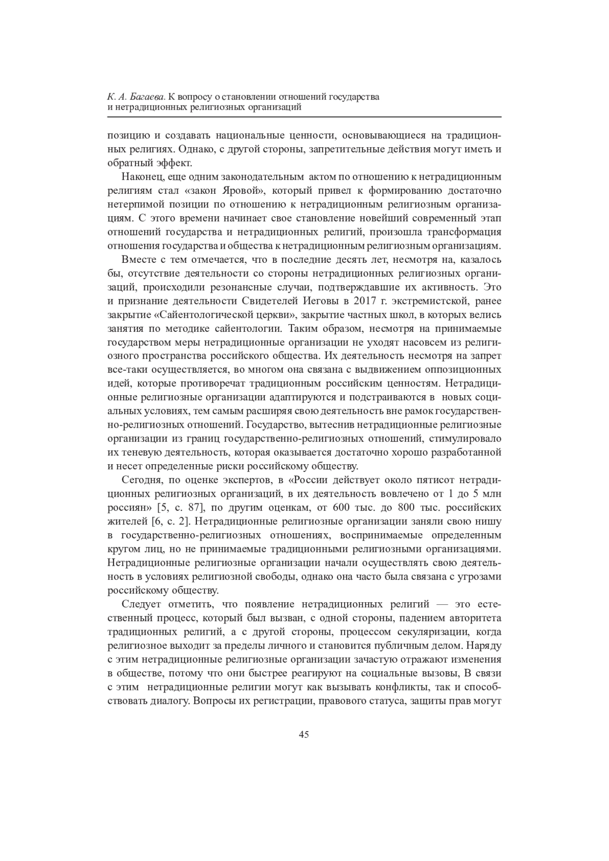 3. Багаева К. А. К вопросу о нетрадиционных религиозных организациях в России // Евразийство и мир. 2019. № 2. С. 80-84. Текст: непосредственный. EDN: JOERGY