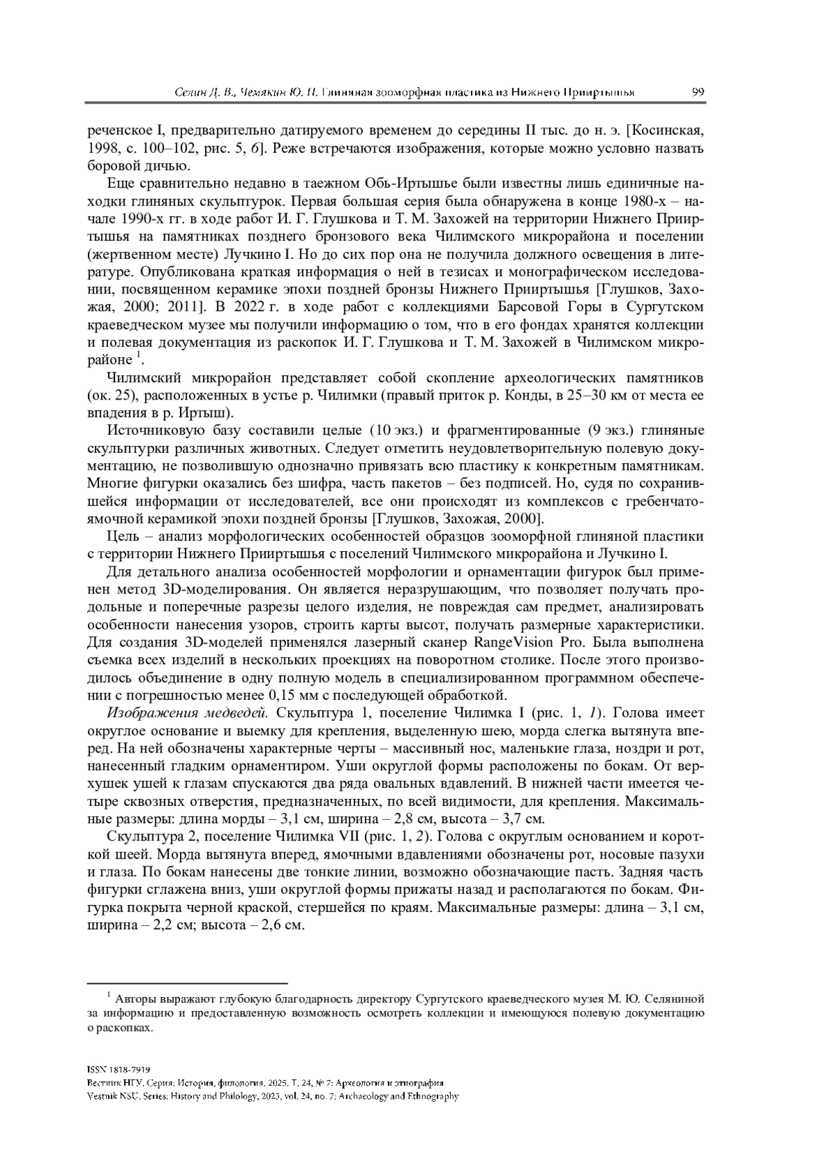 Выполнен анализ морфологических особенностей образцов зооморфной глиняной пластики с территории Нижнего Прииртышья, с поселений Чилимского микрорайона и Лучкино I, с применением 3D-моделирования. Всего было изучено десять целых и девять фрагментированных скульптур, обнаруженных в комплексах с гребенчато-ямочной керамикой. Выделено три типа: изображения медведей, лисицы и птиц. Типы разделяются на подтипы и варианты, для каждого из которых характерны свои особенности морфологии и орнаментации. Все фигурки медведей объединяет детализация морды, акцент на нос и глаза, приемы нанесения узоров. Уникально стилизованное изображение лисицы, на нем обозначены характерные черты этого хищника: узкая вытянутая морда, заостренные уши, длинный объемный хвост. Фигурки птиц также стилизованы, их объединяет наличие анатомических деталей. Скульптуры подтипа 2 отражают попытки передачи динамики движения. Проанализированная коллекция находит аналогии в материалах эпохи поздней бронзы Западной Сибири в лозьвинской, атлымской, барсовской культурах.