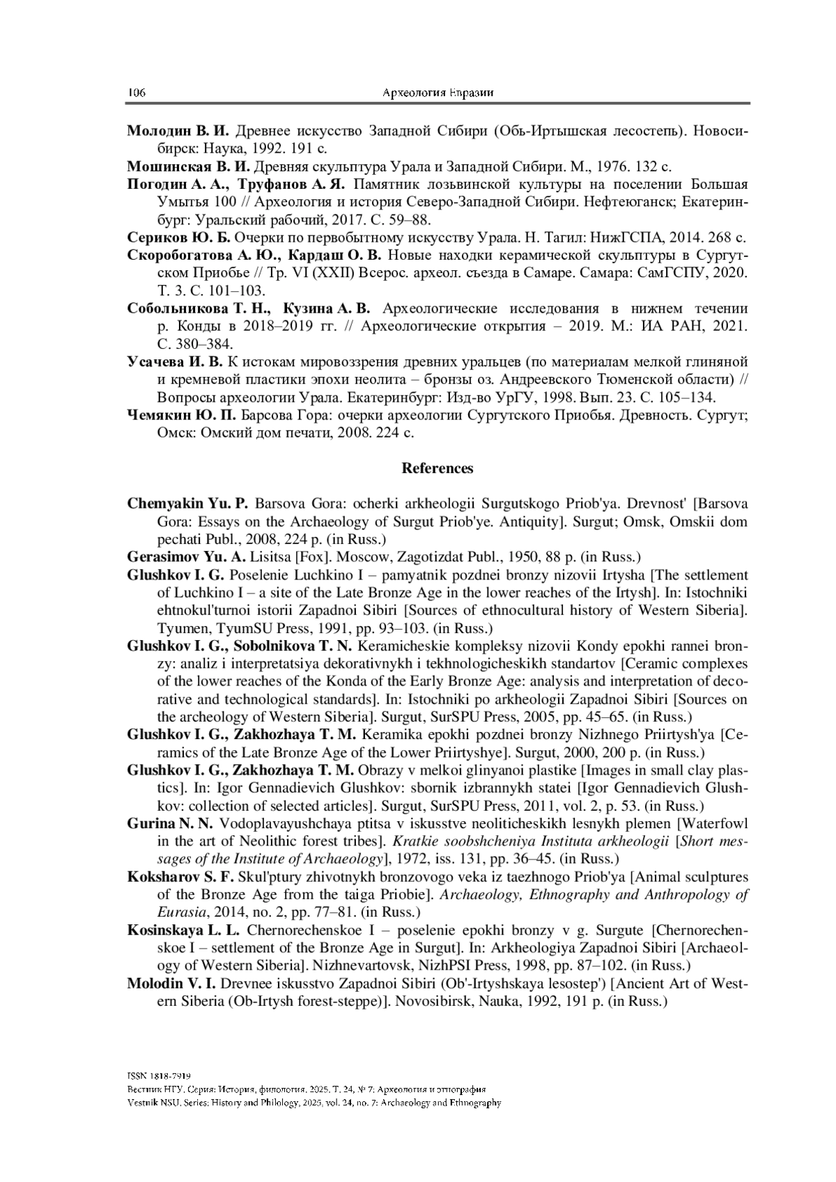 6. Глушков И. Г., Собольникова Т. Н. Керамические комплексы низовий Конды эпохи ран ней бронзы: анализ и интерпретация декоративных и технологических стандартов // Источники по археологии Западной Сибири. Сургут: СурГПУ, 2005. С. 45-65.