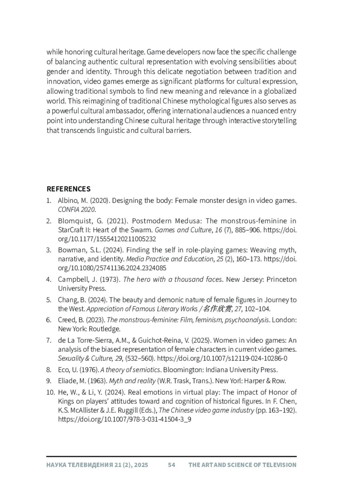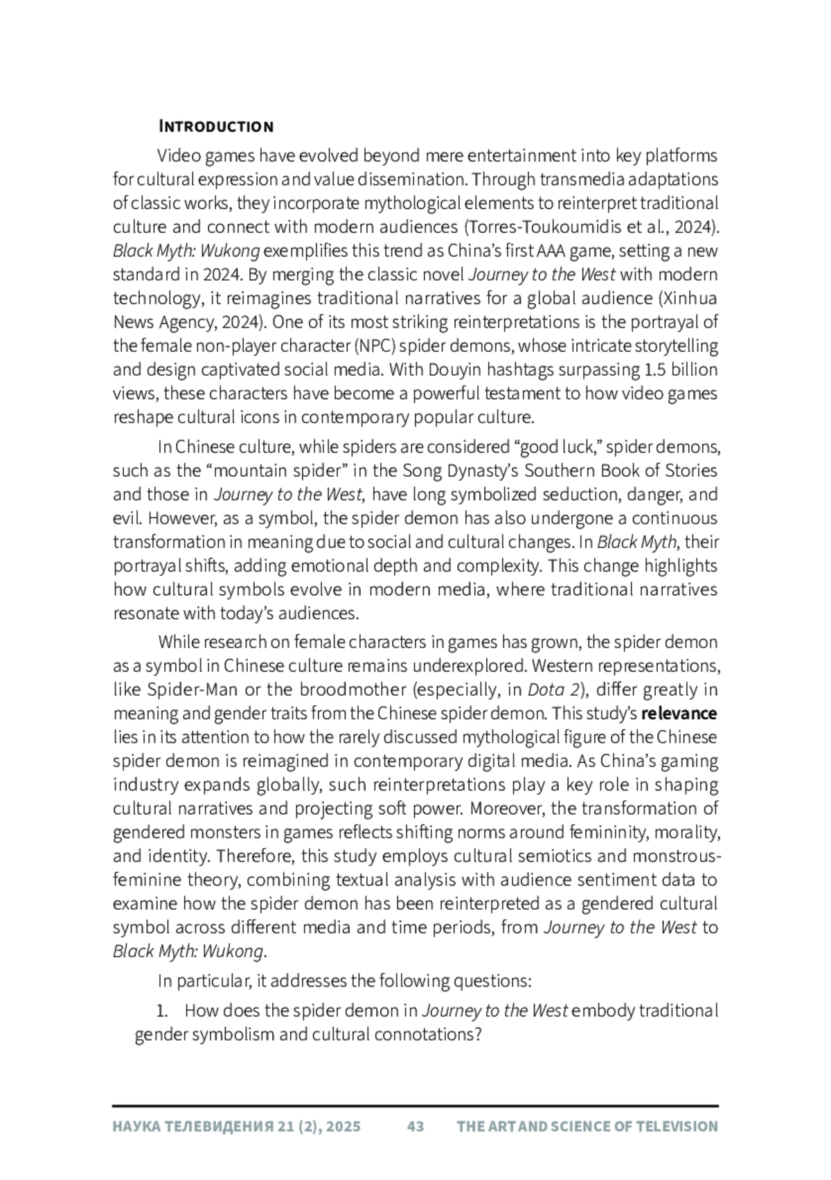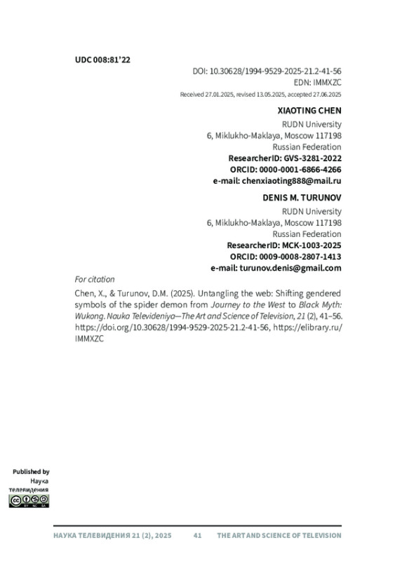 В данной статье рассматривается переосмысление образа демона-паука как традиционного китайского гендерного символа, начиная с романа «Путешествие на Запад» (У Чэнъэнь, 1592) и заканчивая современной видеоигрой «Черный миф: Укун» (2024). Используя культурную семиотику и теорию чудовищно-женственного, авторы сравнивают материалы романа и игры посредством текстового анализа и анализа тональности 1000 наиболее популярных комментариев к связанным видеороликам Bilibili. Анализ тональности показывает преимущественно положительный прием (69%), хотя критика гендерной репрезентации сохраняется. Результаты показывают, что благодаря нарративной реконструкции в игре демоны-пауки превращаются из одномерных соблазнительниц в многомерные фигуры с более человечным внешним видом. Их образы не только отражают глубокие эмоции, моральные дилеммы и самосознание, но и включают в себя эстетику, вдохновленную династией Тан, для усиления их культурного контекста, сохраняя при этом определенные чудовищные черты и ощущение трагической судьбы. Более того, в статье подчеркивается, что вместо того, чтобы отказываться от традиционных архетипов, игра переосмысливает их с эмоциональной глубиной и символической преемственностью, иллюстрируя, как культурные символы могут быть адаптированы для отражения более широких изменений в гендерном дискурсе и сложности повествования.