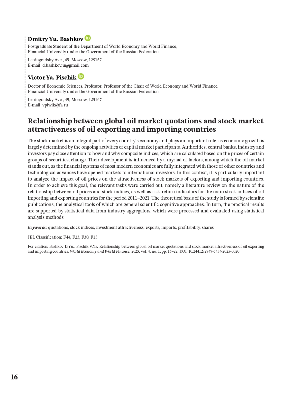 Фондовый рынок является неотъемлемой частью экономики любого государства, поскольку экономический рост в значительной степени обуславливается непрерывной деятельностью участников рынка капитала, который играет ключевую роль в экономике страны благодаря развитию промышленности и торговли, а также росту национальный системы хозяйствования за счет мобилизации внутренних и иностранных сбережений для инвестиций в корпоративный сектор и финансирования государственных капитальных проектов. Ценные бумаги, являющиеся залогом ликвидности для инвесторов, также торгуются на фондовом рынке, а формирование их цены считается наблюдаемым показателем эффективности бизнеса и контроля за экономическим ростом. Следовательно, инструментом, активно используемым для выявления и отслеживания экономических тенденций, являются фондовые индексы: власти, центральные банки, промышленные предприятия и инвесторы уделяют пристальное внимание тому, как и почему именно изменяются сводные индексы, вычисляемые на основе цен определённой группы ценных бумаг. Поскольку финансовые системы большинства современных экономик полностью интегрированы с другими странами и используют технологические достижения, чтобы держать свои рынки открытыми для международных инвесторов, их развитие протекает под влиянием огромного множества факторов, среди которых выделяются нефтяные котировки. В этой связи особую актуальность представляет анализ влияния цены нефти на привлекательность фондового рынка стран-экспортеров и импортеров. Для достижения поставленной цели выполнены соответствующие задачи, а именно осуществлен обзор литературы на предмет сущности взаимосвязи нефтяных котировок и фондовых индексов, а также получены показатели риск-доходности для основных фондовых индексов стран импортеров и экспортеров нефти за период 2011 –2021 гг. Теоретическую основу исследования составили научные публикации, инструментами анализа которых стали общенаучные подходы к познанию. В свою очередь практические результаты подкреплены статистическими данными отраслевых агрегаторов, для обработки и оценки которых использовались методы статистического анализа.