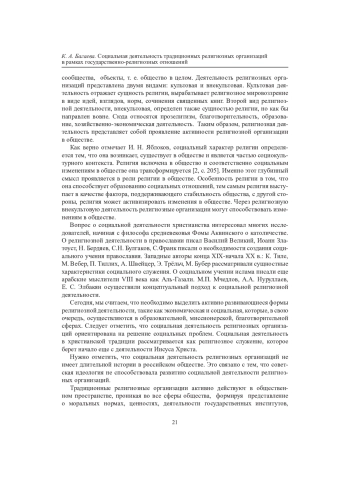 В статье проанализирован один из составляющих религию элементов - религиозная деятельность, которая бывает культовой и внекультовой. Наибольший интерес для исследования представляет внекультовая деятельность религиозных организаций. На современном этапе развития общества через внекультовую деятельность религиозные организации проявляют активность в практической сфере. Это миссионерство, благотворительность, религиозное образование, помощь социально незащищенным слоям населения и многое другое. В исследованиях такой вид деятельности получил название «социальная деятельность». Государство обращает большое внимание на данный вид деятельности религиозных организаций, поддерживая ее различными способами. В статье приведены примеры подобной деятельности со стороны традиционных религиозных организаций, в частности социальная деятельность в пенитенциарной системе. Отмечается, что такие религиозные организации, как православие, ислам, иудаизм, разработали социальные принципы, в которых указали основание социальной деятельности.