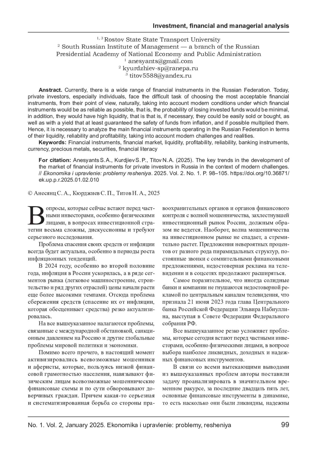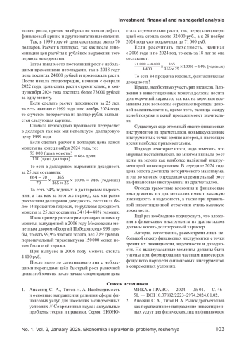 2. Анесянц С. А., Титов Н. А. Рынок драгметаллов как перспективное направление инвестиционных услуг для физических лиц на финансовом рынке. - Первый экономический журнал. - 2023. - № 10(340). - С. 126-132. EDN: MPQVAW