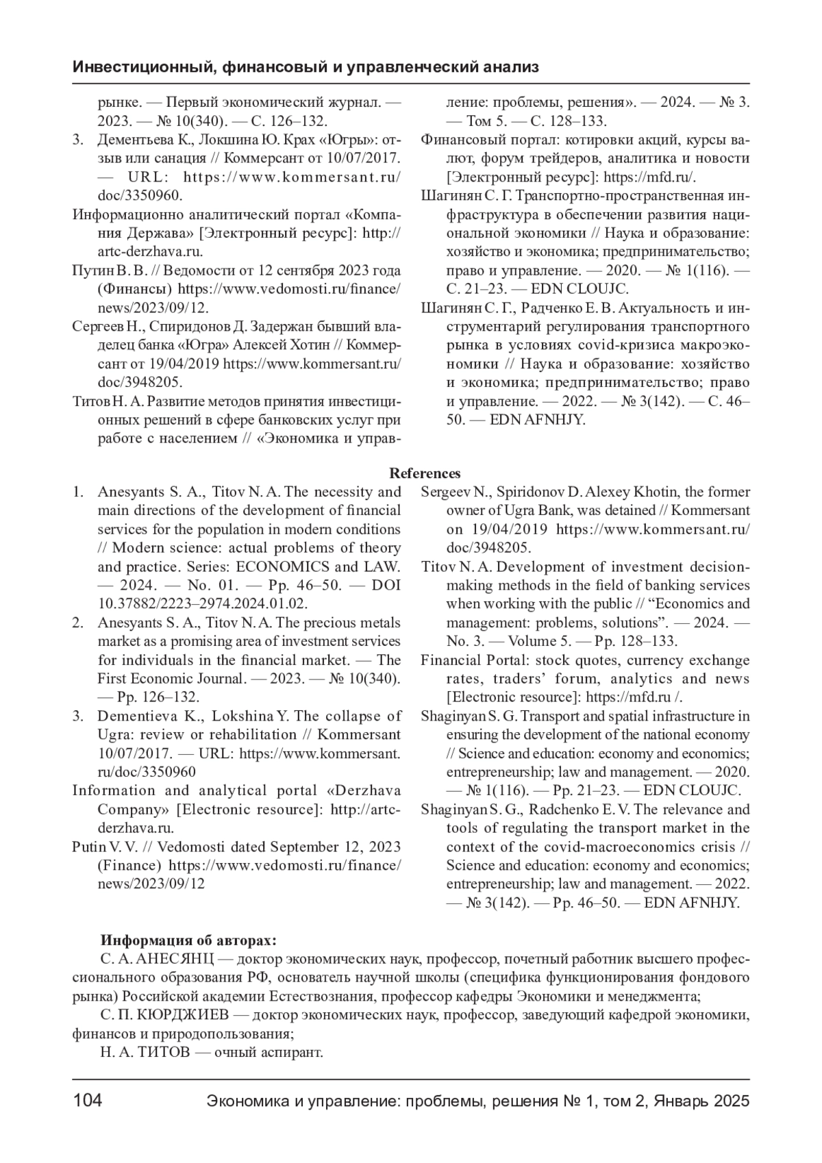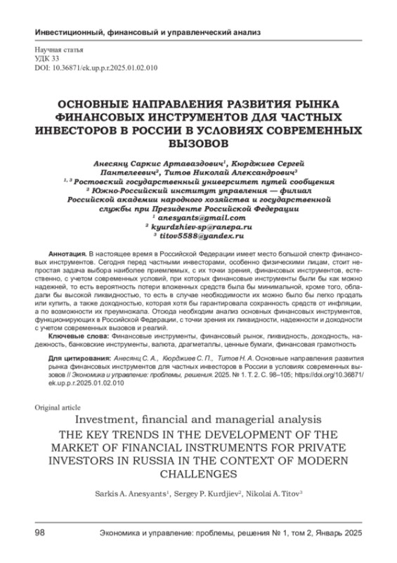 1. Анесянц С. А., Титов Н. А. Необходимость и основные направления развития сферы финансовых услуг для населения в современных условиях // Современная наука: актуальные проблемы теории и практики. Серия: ЭКОНОМИКА и ПРАВО. - 2024. - № 01. - С. 46- 50. DOI: 10.37882/2223-2974.2024.01.02 EDN: KLGVHH