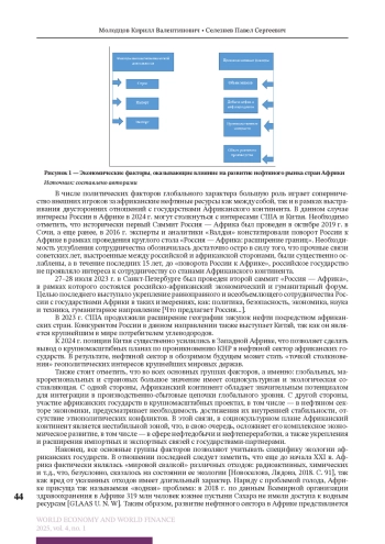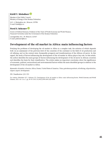 Исследование проблем развития нефтяного рынка в Африке представляет собой комплексную задачу, решение которой зависит как от оценки предшествующего уровня стран континента в области нефтедобычи и нефтепереработки, так и от текущего состояния, обозримых перспектив и трансформаций африканского нефтяного сектора. В этой связи, ключевую роль играет изучение факторов, оказывающих влияние на развитие нефтяного рынка в Африке. В настоящей статье автор определяет основные группы факторов, оказывающих воздействие на развитие нефтяного сектора африканских стран, выявляет основания для их классификации. В статье делается важный вывод о значимости экономических, политических, социокультурных и экологических факторов в рамках основных выделенных групп применительно к развитию нефтяного рынка в Африке.