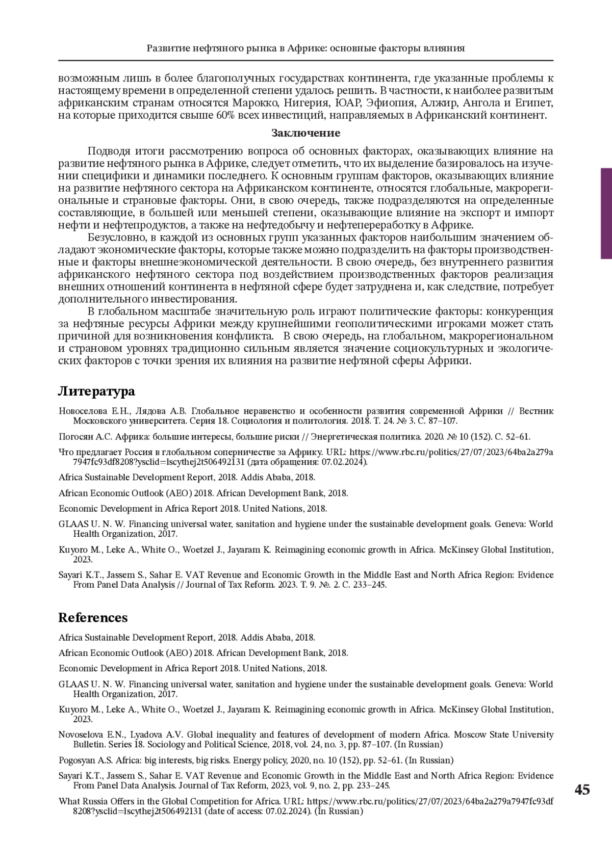 1. Новоселова Е.Н., Лядова А.В. Глобальное неравенство и особенности развития современной Африки // Вестник Московского университета. Серия 18. Социология и политология. 2018. Т. 24. № 3. С. 87-107.