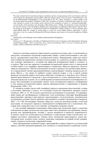Статья посвящена изучению роли традиционной символики в процессе построения индийской нации в колониальный период. В фокусе внимания автора находятся элементы традиционной индийской культуры, которые в процессе развития представлений о собственной нации существенно трансформировались и постепенно приобретали принципиально новые смыслы. Рассмотрение эволюции религиозной символики позволило проследить сложность и противоречивость этого процесса в колониальной Индии. Исследование показало, что трансформированная данная символика и возникающие с ее привлечением концепции могли иметь разнообразные варианты трактовки и восприятия внутри колониального общества.