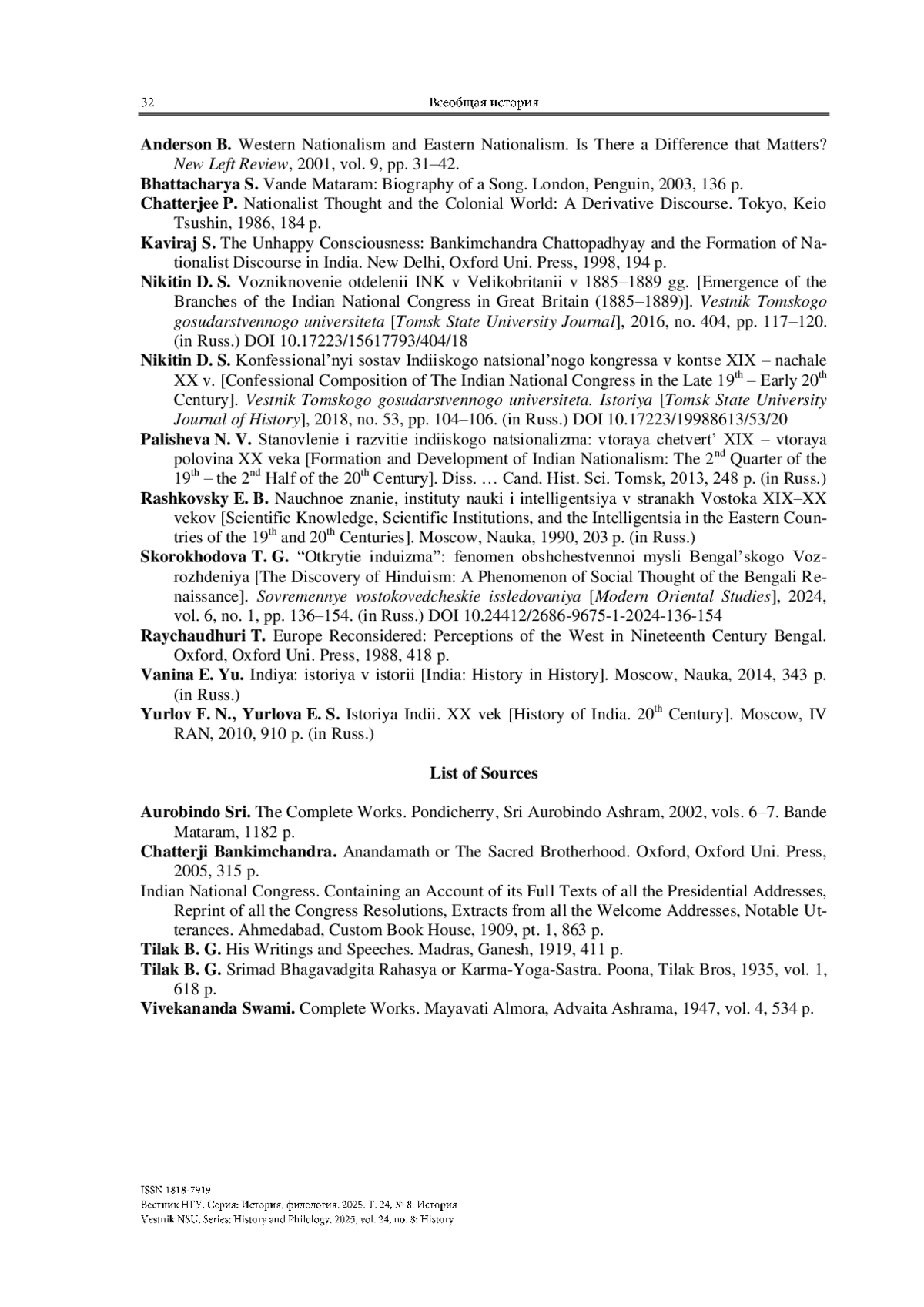 7. Скороходова Т. Г. «Открытие индуизма»: феномен общественной мысли Бенгальского Возрождения // Современные востоковедческие исследование. 2024. Т. 6, № 1. С. 136-154. https://doi.org/10.24412/2686-9675-1-2024-136-154