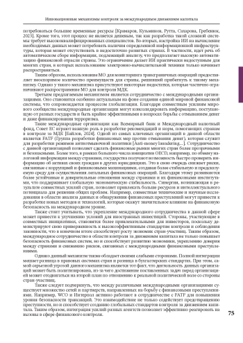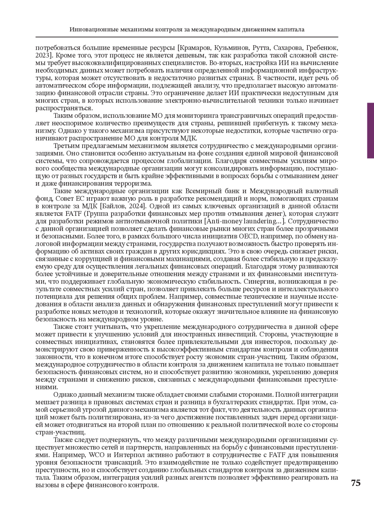 В условиях стремительного прогресса технологий и усложнения глобальных экономических процессов появляются инновационные способы осуществления трансграничных финансовых операций, что влечет за собой порождение ранее неизвестных и не всегда прогнозируемых рисков для национальных экономик принимающих стран. Успешное управление этими вызовами требует от государств непрерывной адаптации к стремительно трансформирующимся тенденциям международного движения капитала посредством внедрения передовых методов мониторинга и контроля, а также разработки высокоточных механизмов идентификации участников финансовых операций. Предметом изучения в данной статье являются новые механизмы контроля за международным движением капитала, имеющие большие перспективы использования. Целью исследования является выявление потенциально эффективных методов контроля за международным движением капитала и обоснование необходимости их использования. Статья ставит своей задачей исследование и систематизацию инновационных механизмов, способствующих более эффективному контролю за движением капитала в современных экономических условиях. Основное внимание уделено разработке подходов, которые обеспечивают прозрачность, минимизацию рисков и устойчивость финансовых потоков в глобальной экономике. Результатами исследования является разработка и обоснование инновационных механизмов, направленных на усиление прозрачности и эффективности контроля за международным движением капитала. Предложенные подходы демонстрируют потенциал для снижения финансовых рисков, усиления регуляторного надзора и адаптации к динамичным условиям глобальных рынков. Значимость статьи заключается в её вкладе в развитие подходов к регулированию международного движения капитала с использованием инновационных механизмов, что способствует повышению стабильности и устойчивости глобальной финансовой системы. Предложенные решения могут быть использованы как практическими регуляторами, так и исследователями для минимизации рисков и улучшения прозрачности транзакций на международных рынках.