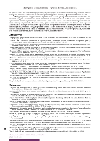 5. Курьянова И.В. Роль кредитных учреждений в борьбе с отмыванием денег и финансированием терроризма // Научный вестник: финансы, банки, инвестиции. 2024. № 2 (67). С. 78-88.