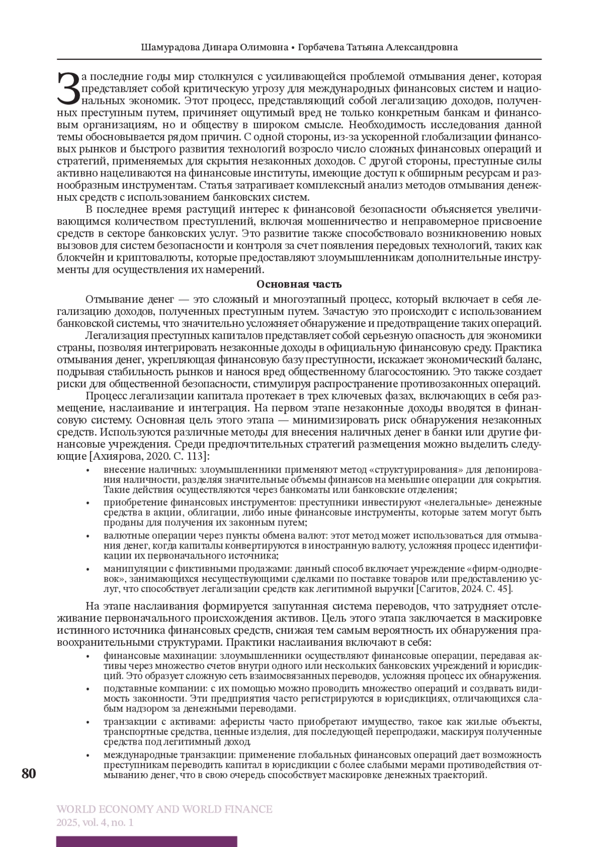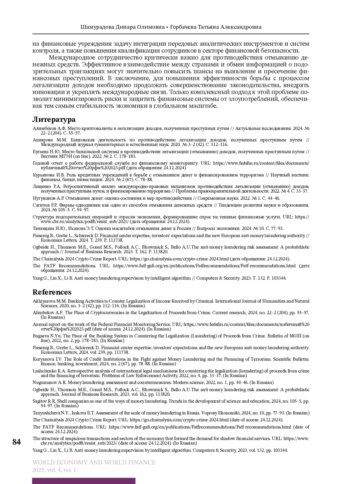 10. Танющева Н.Ю., Исакова Э.Т. Оценка масштабов отмывания денег в России // Вопросы экономики. 2024. № 10. С. 77-93.