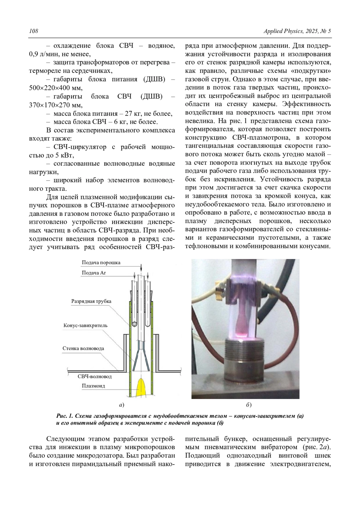 Описанная в настоящей работе экспериментальная установка для исследования СВЧ-плазменной модификации дисперсных мате-риалов была создана на базе действующего стенда с разработанным ранее СВЧ-плазмотроном волноводного типа, дополненного специально разработанными модулями для подачи рабочего газа и дисперсных частиц в безэлектродный СВЧ-разряд атмосферного давления – вихревым газоформирователем, микродозатором, винтовым шнеком и смесителем порошков с рабочим газом
