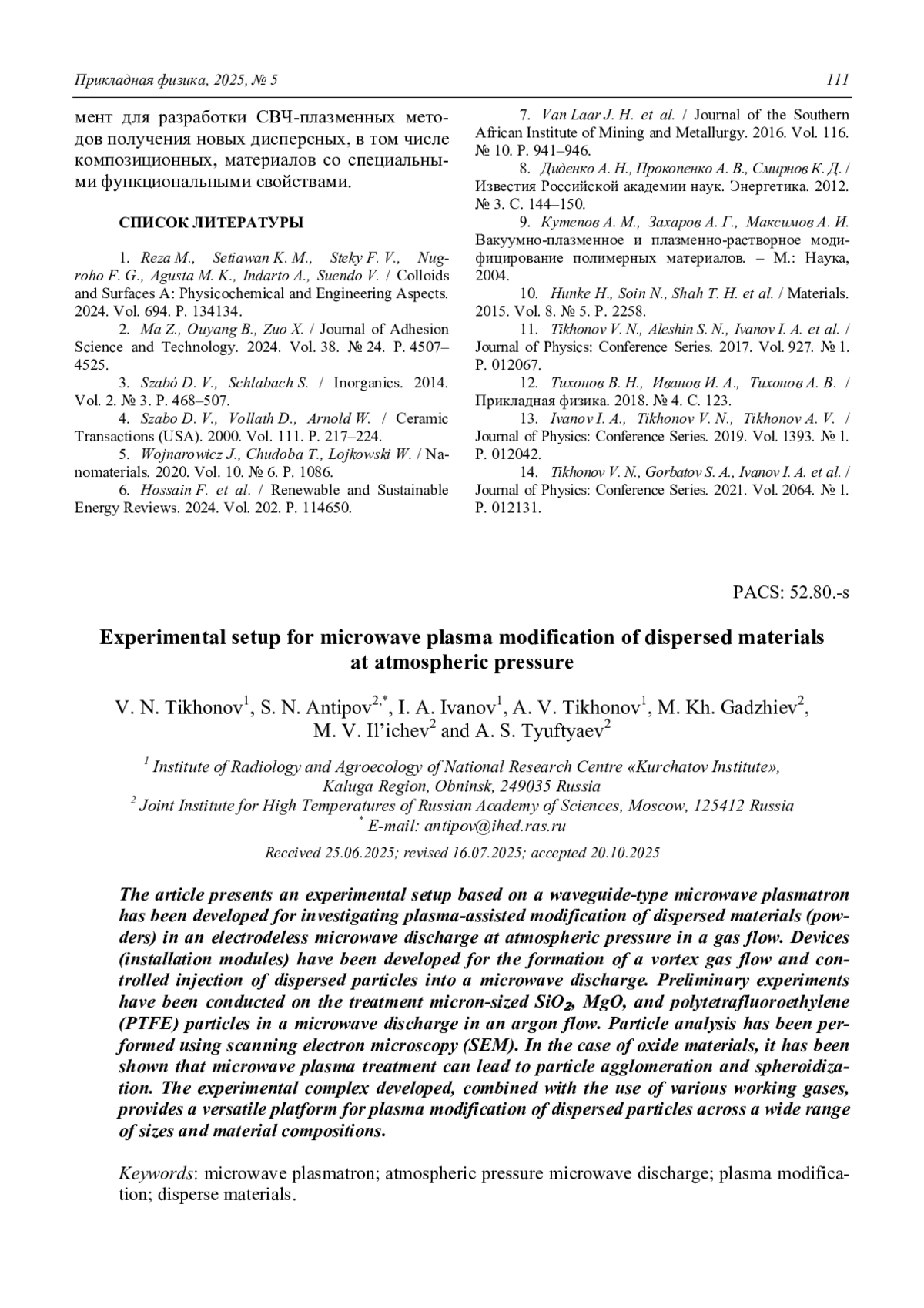 - Tikhonov V. N., Gorbatov S. A., Ivanov I. A. et al., Journal of Physics: Conference Series 2064 (1), 012131 (2021).