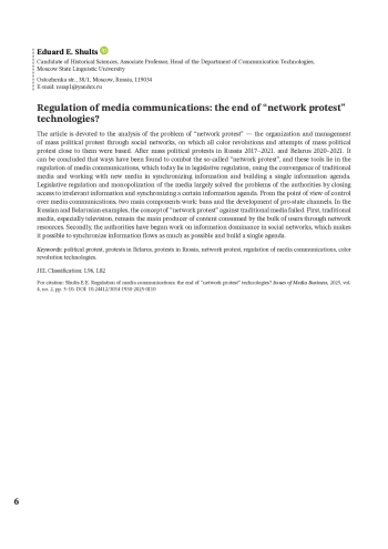 Статья посвящена анализу проблемы «сетевого протеста» — организации и управления массовым политическим протестом через социальные сети, на котором базировались все цветные революции и близкие к ним попытки массового политического протеста. После массовых политических протестов в России 2017–2021 гг. и Белоруссии 2020–2021 гг. можно заключить, что были найдены пути борьбы с т. н. «сетевым протестом», и эти инструменты лежат в регулировании медиакоммуникаций, которые сегодня заключаются в законодательном регулировании, использовании конвергентности традиционных СМИ и работы с новыми медиа в синхронизации информации и выстраивании единой информационной повестки. Законодательное регулирование и монополизация СМИ во многом решили проблемы властей путем закрытия доступа к неактуальной информации и синхронизации определенной информационной повестки. С точки зрения контроля за медиакоммуникациями работают две главные составляющие: запреты и развитие прогосударственных каналов. В российском и белорусском примерах потерпела фиаско концепция «сетевого протеста» против традиционных СМИ. Во-первых, традиционные СМИ, особенно телевидение, остаются главным производителем контента, потребляемого основной долей пользователей через сетевые ресурсы. Во-вторых, власть начала работу по информационному доминированию и в социальных сетях, что позволяет максимально синхронизировать информационные потоки и выстраивать единую повестку дня.