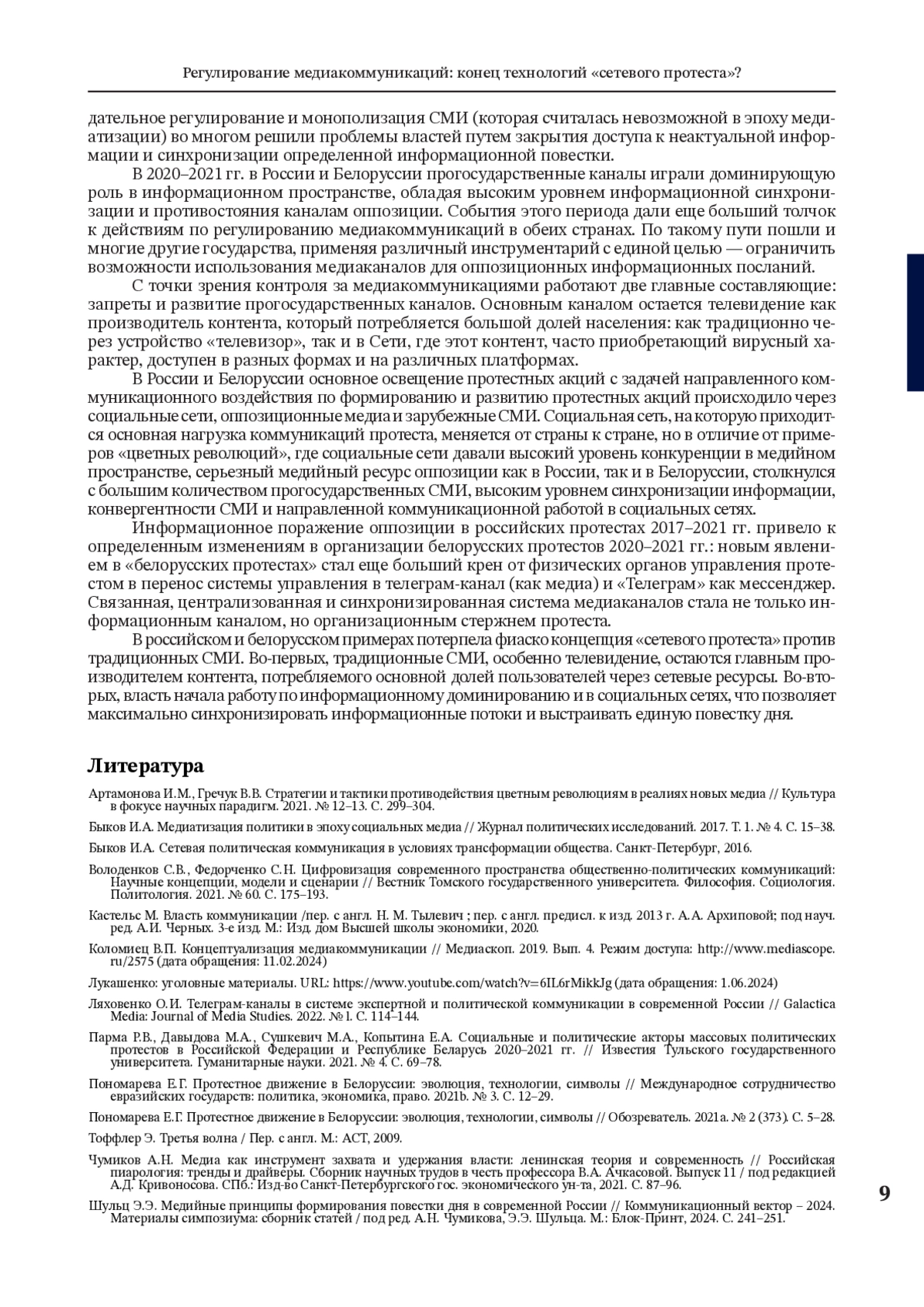 4. Володенков С.В., Федорченко С.Н. Цифровизация современного пространства общественно-политических коммуникаций: Научные концепции, модели и сценарии // Вестник Томского государственного университета. Философия. Социология. Политология. 2021. № 60. С. 175-193.