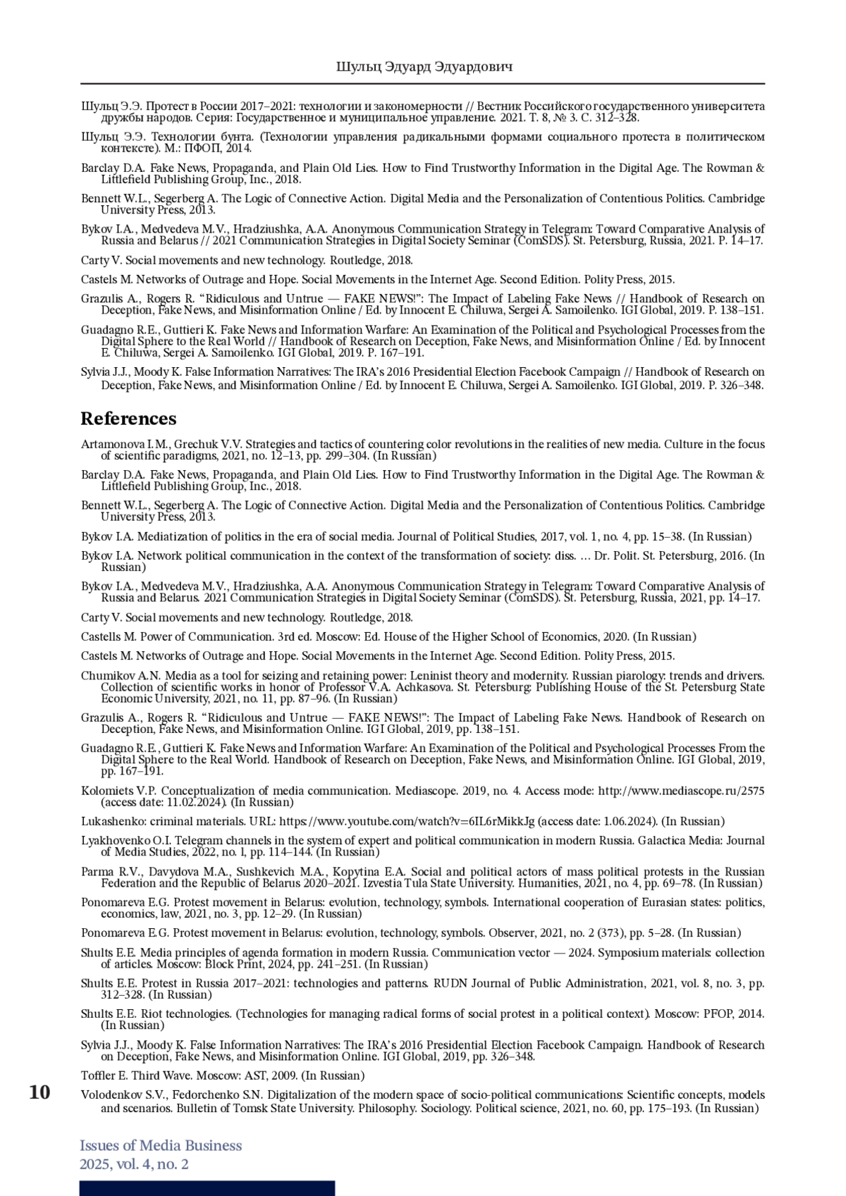14. Шульц Э.Э. Медийные принципы формирования повестки дня в современной России // Коммуникационный вектор - 2024. Материалы симпозиума: сборник статей / под ред. А.Н. Чумикова, Э.Э. Шульца. М.: Блок-Принт, 2024. С. 241-251.