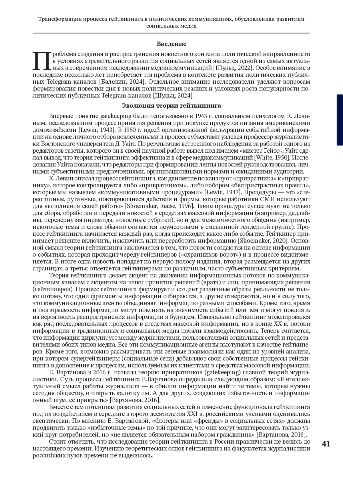В статье исследуется эволюция теории гейткипинга под влиянием развития социальных медиа и как, следствие этого, трансформация функционала процесса гейткипинга, обусловленная рядом факторов: утратой влияния традиционных СМИ, появлением особой категории супергейткиперов-операторов социальных сетей, внедрением алгоритмического гейткипинга в процесс фильтрации информационного потока. Автор рассматривает предпосылки формирования такого нового явления в коммуникационном взаимодействии, как «гейткипинг аудитории», который понимается как процесс, в ходе которого аудитория социальных сетей на основе собственных критериев значимости новостей способствует их дальнейшему распространению. На примере России показано, как государство защищает свои интересы в информационном пространстве путем формирования особых групп гейткиперов. В разных исторических условиях это могут быть разные представители общества, обладающие авторитетом среди электората, но в рассматриваемом временном периоде эту роль эффективно играют военные корреспонденты, которые проводят отбор и распространение информации через свои политические публичные Telegram-каналы в координации с государственными структурами для формирования благоприятного для политической системы страны общественного мнения. Автор обращает внимание на то, что в условиях перманентной сетевой войны в глобальном информационном пространстве до настоящего времени методы и средства ведения сетевой войны не регламентированы ни национальными правовыми актами, ни международными соглашениями.