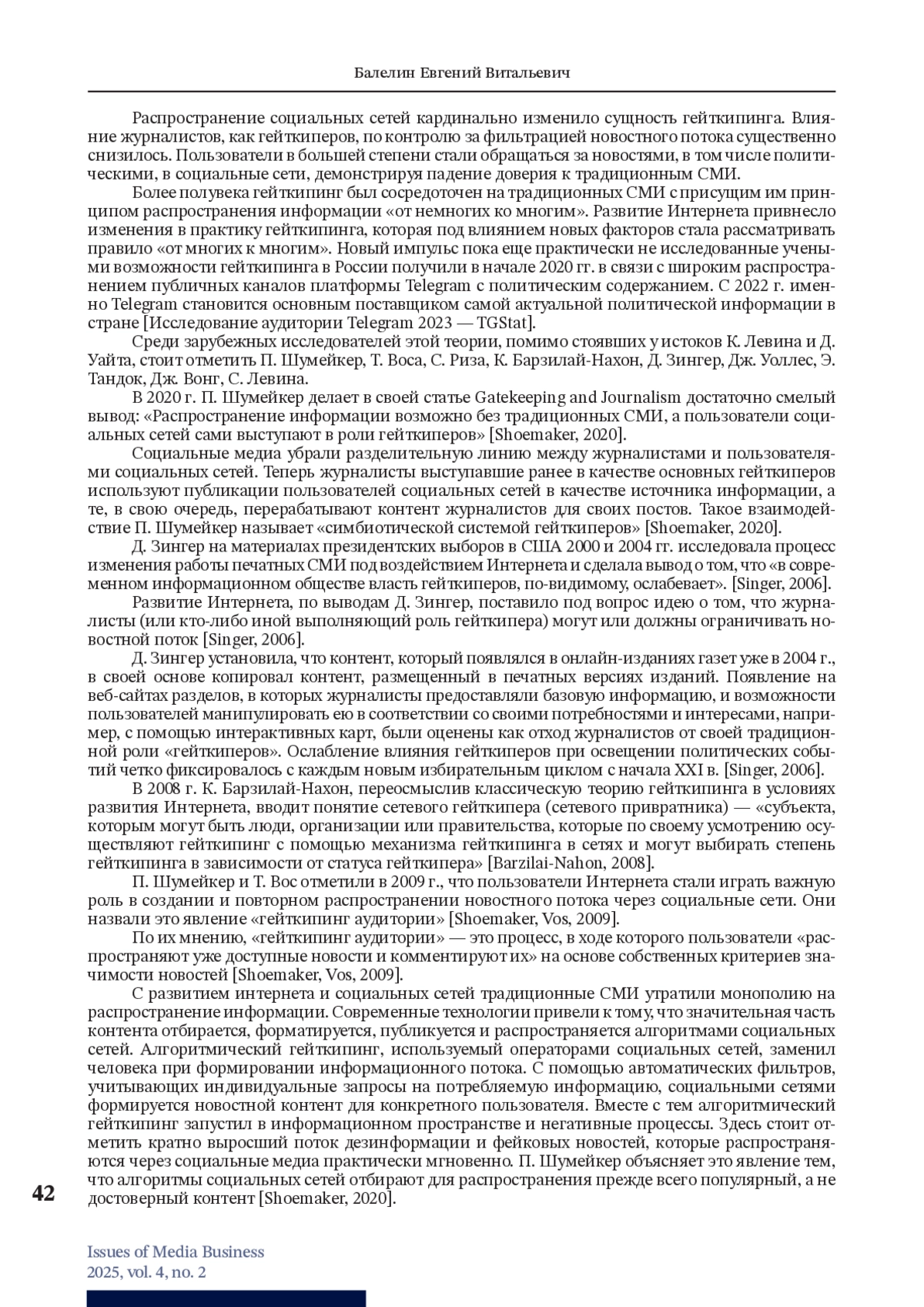 10. Shoemaker P.J. Gatekeeping and journalism // Oxford Research Encyclopedia of Communication. 2020.