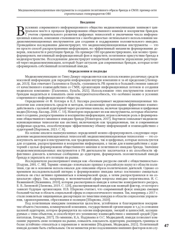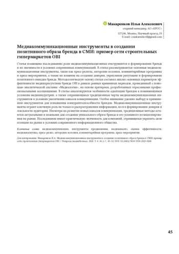 Статья посвящена исследованию роли медиакоммуникационных инструментов в формировании бренда и их значимости в условиях современных коммуникаций. В статье рассматриваются основные медиакоммуникационные инструменты, такие как пресс-релизы, авторские колонки, комментарийные программы и пресс-мероприятия, а также их влияние на создание доверия, укрепление репутации и формирование позитивного имиджа бренда. Методологическую основу статьи составил анализ основных параметров эффективности медиаприсутствия бренда OBI в рамках равных временных периодов, проведенный с помощью аналитической системы «Медиалогия», на основе критериев, разработанных отраслевыми профессиональными ассоциациями. В статье анализируются особенности адаптации брендов к изменяющимся условиям медиаиндустрии, а также сохраняющиеся традиционные черты медиакоммуникационных инструментов в условиях увеличения каналов коммуникации. Особое внимание уделено выбору и применению инструментов для повышения конкурентоспособности брендов. Медиакоммуникационные инструменты играют ключевую роль не только в распространении информации, но и в формировании доверия и лояльности аудитории. Несмотря на развитие новых каналов коммуникации, традиционные методы остаются актуальными и важными для создания уникального образа бренда и его успешного позиционирования на рынке. Исследование имеет практическую значимость для компаний, стремящихся укрепить свои позиции на рынке в условиях современного информационного общества.