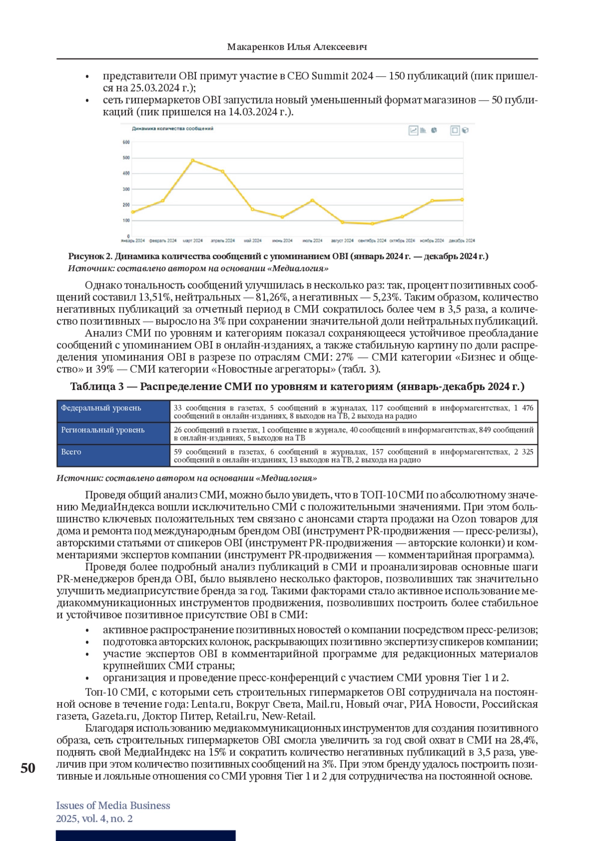 В условиях современного информационного общества медиакоммуникации занимают центральное место в процессе формирования общественного мнения и восприятия брендов. С учетом стремительного развития цифровых технологий и увеличения числа информационных каналов, компании сталкиваются с необходимостью оптимального использования медиакоммуникационных инструментов для создания и поддержания положительного имиджа. Проведенное исследование демонстрирует, что медиакоммуникационные инструменты — это не просто способ распространения информации, но эффективный механизм формирования доверия, лояльности и репутации бренда. На примере OBI продемонстрировано, как можно трансформировать негативный информационный фон и нарастить позитивное присутствие бренда в медиапространстве. Исследование демонстрирует конкретный механизм управления репутацией через медиакоммуникации, который будет актуален для современных брендов, которые хотят сформировать собственный позитивный имидж.