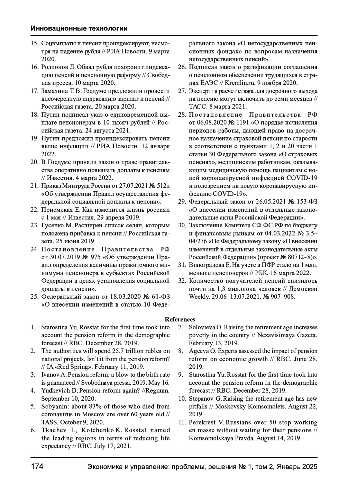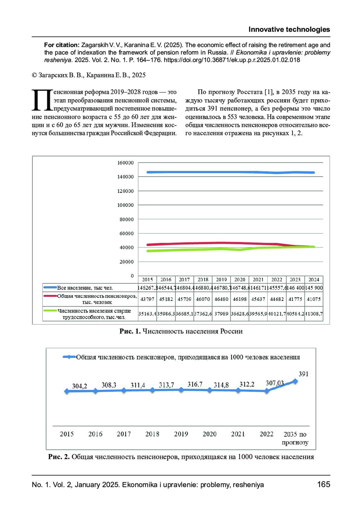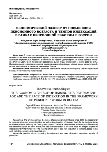 ЗАГАРСКИХ В. В., КАРАНИНА Е. В. ЭКОНОМИЧЕСКИЙ ЭФФЕКТ ОТ ПОВЫШЕНИЯ ПЕНСИОННОГО ВОЗРАСТА И ТЕМПОВ ИНДЕКСАЦИЙ В РАМКАХ ПЕНСИОННОЙ РЕФОРМЫ В РОССИИ // ЭКОНОМИКА И УПРАВЛЕНИЕ: ПРОБЛЕМЫ, РЕШЕНИЯ. 2025. ТОМ 2 № 1