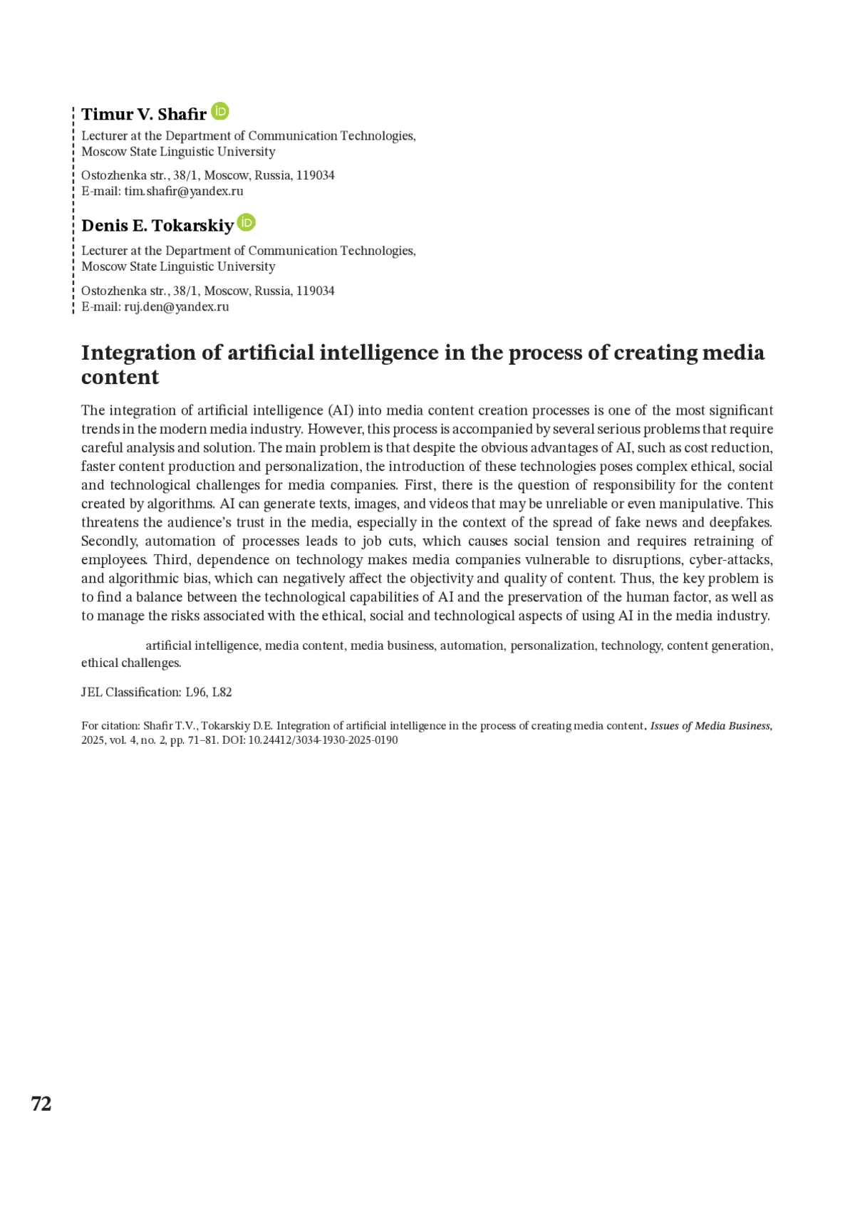 Интеграция искусственного интеллекта (ИИ) в процессы создания медиаконтента представляет собой одну из наиболее актуальных и сложных проблем современной науки и медиаиндустрии. В условиях стремительного развития технологий ИИ становится ключевым инструментом трансформации медиаландшафта. технологии искусственного интеллекта кардинально меняют традиционные подходы к созданию, распространению и потреблению контента, что приводит к пересмотру роли человека в медиапроцессах [Соловьёв, 2021. С. 60–62]. Кроме того, социальные, культурные и психологические аспекты взаимодействия человека с ИИ становятся предметом активных дискуссий. Искусственный интеллект не только трансформирует профессиональные практики, но и становится неотъемлемой частью повседневной жизни, вызывая одновременно восхищение и опасения [Шомова, Качкаева, 2024. С. 12].