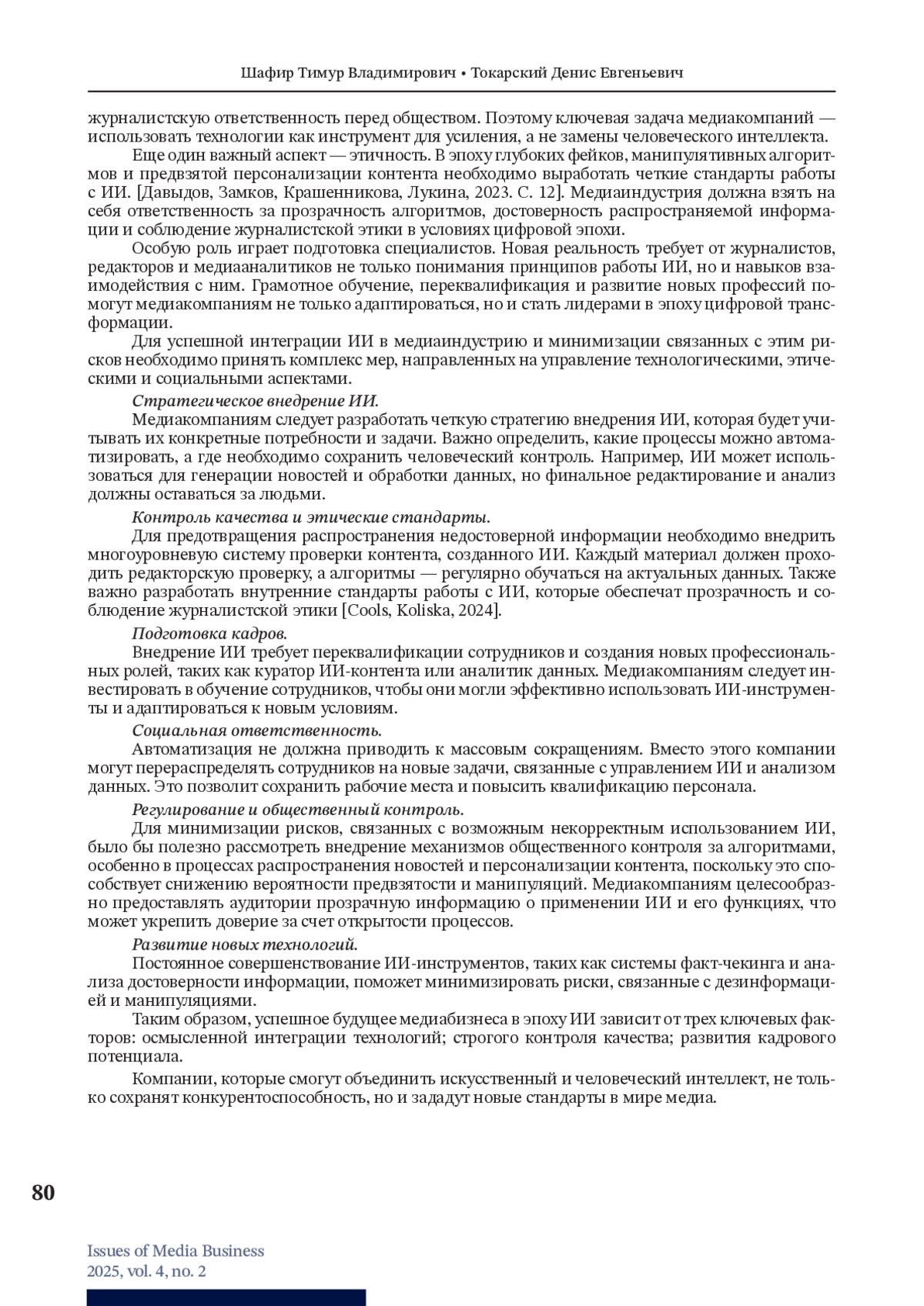 2. Дроздов Д.Н. Генерируемый искусственным интеллектом контент как составная часть контент-стратегии современных медиа // Журнал Белорусского государственного университета. Журналистика. 2024. № 2. С. 25-30.