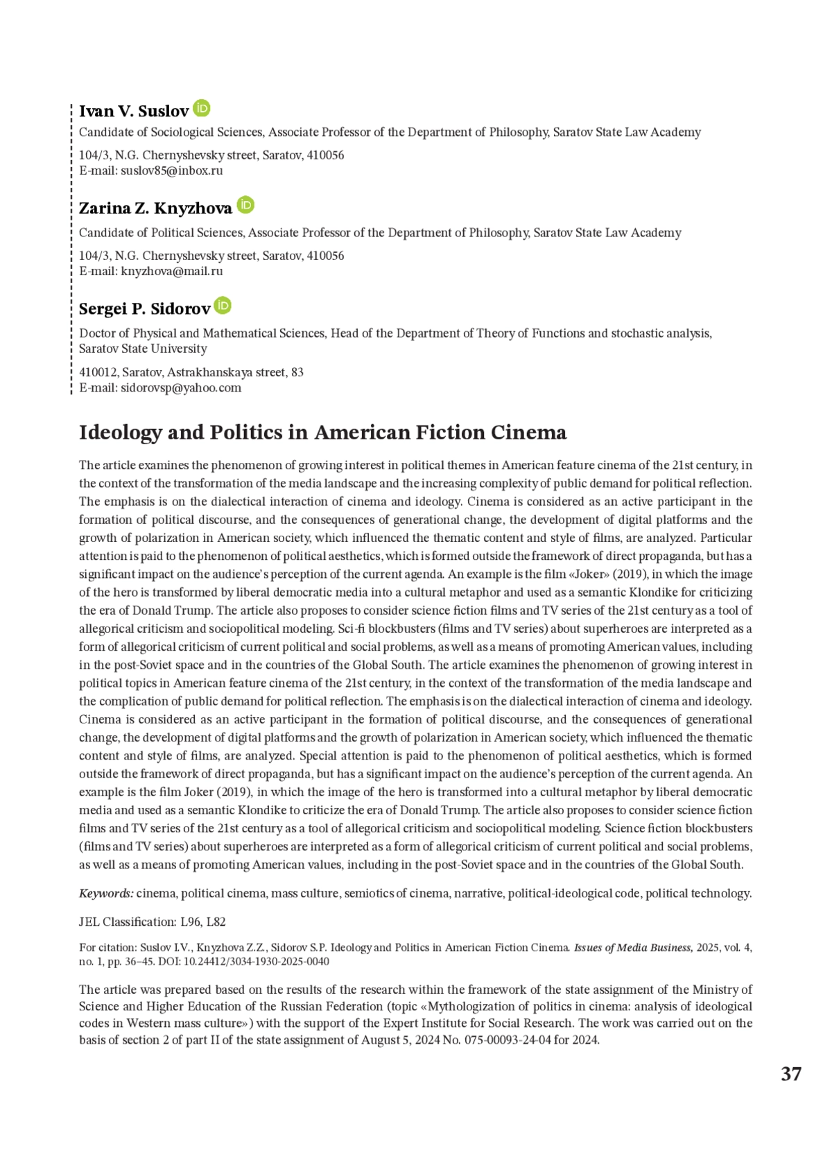 В статье исследуется феномен рост интереса к политическим темам в американском игровом кинематографе XXI в., в условиях трансформации медиапейзажа и усложнения общественного запроса на политическую рефлексию. Акцент сделан на диалектическом взаимодействии кино и идеологии. Кино рассматривается как активный участник формирования политического дискурса, а также анализируются последствия смены поколений, развитие цифровых платформ и рост поляризации в американском обществе, повлиявшие на тематическое наполнение и стилистику фильмов. Отдельное внимание уделено феномену политической эстетики, формирующейся вне рамок прямой пропаганды, но оказывающей значительное влияние на восприятие зрителями актуальной повестки. Примером служит фильм «Джокер» (2019), в котором образ героя либерально-демократическими медиа трансформирован в культурную метафору и используется как семантический клондайк для критики эпохи правления Дональда Трампа. В статье также предлагается рассматривать фантастические фильмы и сериалы XXI в. как инструмент иносказательной критики и социополитического моделирования. Фантастические блокбастеры (фильмы и сериалы) о супергероях интерпретируются как форма иносказательной критики актуальных политических и социальных проблем, а также средство продвижения американских ценностей, в том числе на постсоветском пространстве и в странах Глобального Юга. В статье исследуется феномен рост интереса к политическим темам в американском игровом кинематографе XXI в., в условиях трансформации медиапейзажа и усложнения общественного запроса на политическую рефлексию. Акцент сделан на диалектическом взаимодействии кино и идеологии. Кино рассматривается как активный участник формирования политического дискурса, а также анализируются последствия смены поколений, развитие цифровых платформ и рост поляризации в американском обществе, повлиявшие на тематическое наполнение и стилистику фильмов. Отдельное внимание уделено феномену политической эстетики, формирующейся вне рамок прямой пропаганды, но оказывающей значительное влияние на восприятие зрителями актуальной повестки. Примером служит фильм «Джокер» (2019), в котором образ героя либерально-демократическими медиа трансформирован в культурную метафору и используется как семантический клондайк для критики эпохи правления Дональда Трампа. В статье также предлагается рассматривать фантастические фильмы и сериалы XXI в. как инструмент иносказательной критики и социополитического моделирования. Фантастические блокбастеры (фильмы и сериалы) о супергероях интерпретируются как форма иносказательной критики актуальных политических и социальных проблем, а также средство продвижения американских ценностей, в том числе на постсоветском пространстве и в странах Глобального Юга.