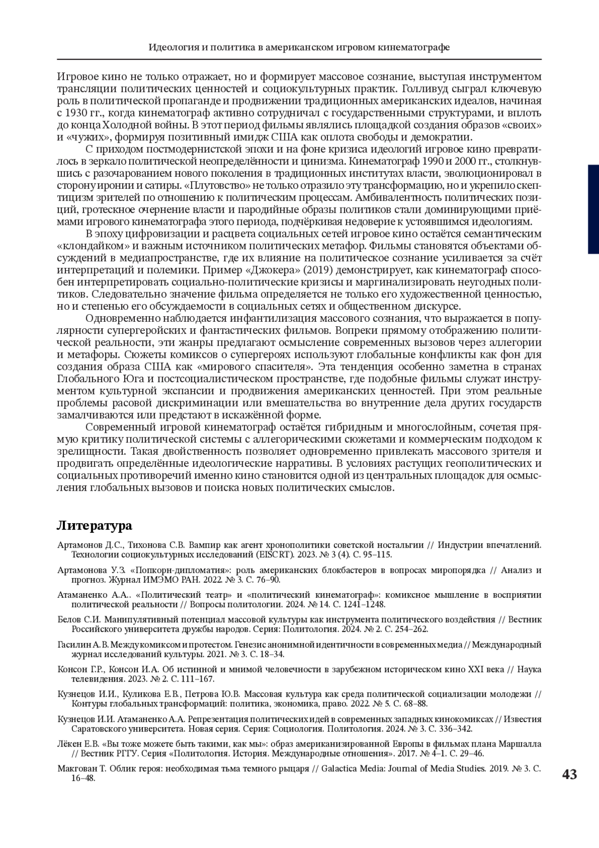 8. Кузнецов И.И. Атаманенко А.А. Репрезентация политических идей в современных западных кинокомиксах // Известия Саратовского университета. Новая серия. Серия: Социология. Политология. 2024. № 3. С. 336-342.