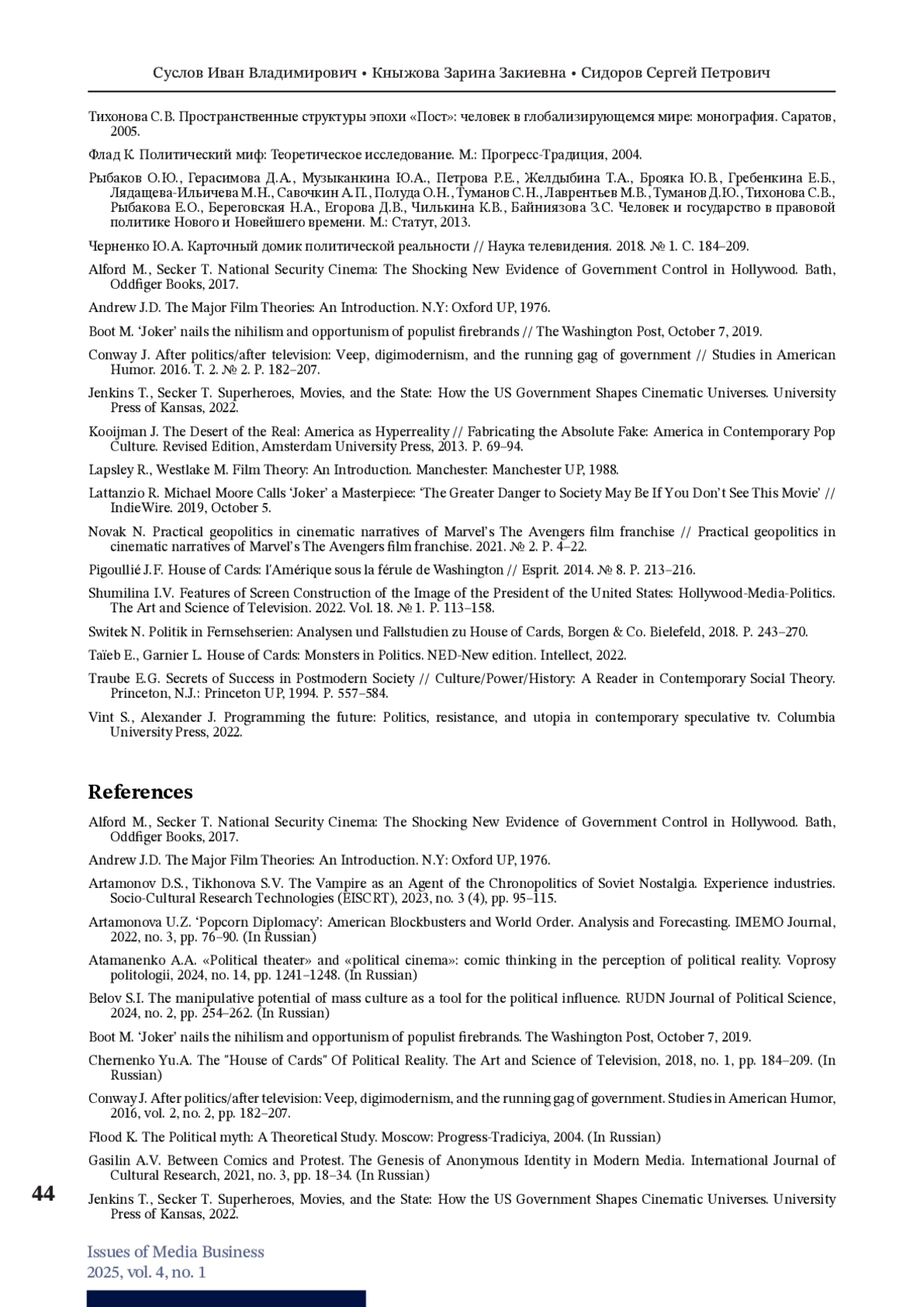 19. Jenkins T., Secker T. Superheroes, Movies, and the State: How the US Government Shapes Cinematic Universes. University Press of Kansas, 2022.