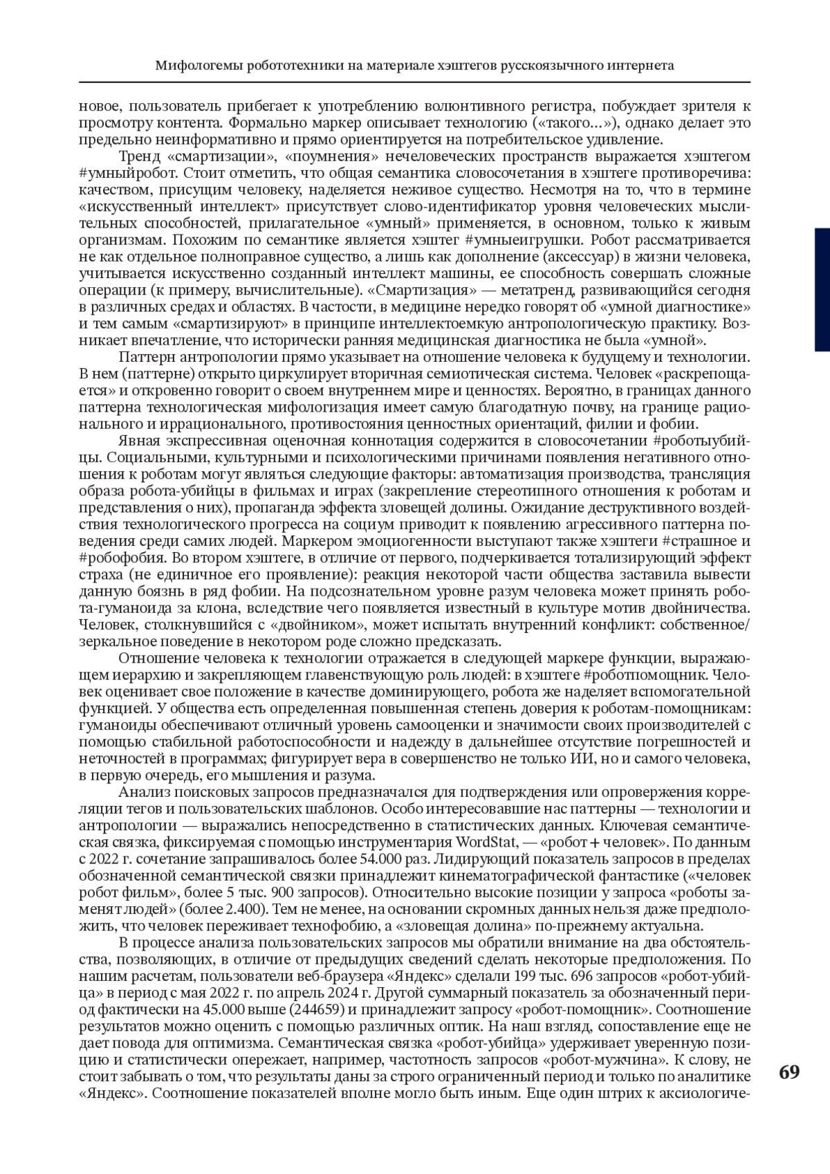 Социальная абсорбция ведущих технологий, условно объединенных концептом «Индустрия 4.0», сопровождается их мифологизацией, формирующей вторичные семиотические системы. В статье исследуются микроформаты (хэштеги) русскоязычного интернета, связанные с робототехникой как ключевой технологией современности. Цель работы — выявление устойчивых мифологических паттернов в непрофессиональных дискурсах. Эмпирическая база включает данные видеохостинга YouTube и социальной сети ВКонтакте за период 2022–2024 гг., а также поисковые запросы инструмента “WordStat” (Яндекс). Проанализировано более сотни хэштегов и пользовательских запросов, что позволило выделить три ключевых паттерна: темпоральный, технологический и антропологический. Первый акцентирует связь робототехники с будущим ( #технологиибудущего, будущееначалось), отражая смесь технологического оптимизма и тревоги. Второй паттерн демонстрирует объективистский подход ( #роботпомощник, умныйробот), где акцент смещен на функциональность, однако имплицитно транслирует иерархию «человек — машина». Третий паттерн, антропологический, раскрывает аксиологическое напряжение: хэштеги роботыубийцы и робофобия фиксируют страх перед автономизацией технологий, тогда как сексробот отражает коммодификацию человеческих отношений. Статистика запросов подтверждает доминирование антропоцентричных тем: например, «робот-женщина» и «секс-робот» опережают нейтральные категории. Исследование выявило, что непрофессиональные дискурсы, в отличие от научных, активно мифологизируют технологии через эмоциональные и ценностные маркеры, что создает почву для формирования коллективных страхов и утопических ожиданий. Работа вносит вклад в изучение технологической мифологии в российском цифровом пространстве, подчеркивая необходимость критического анализа непрофессиональных нарративов для понимания их влияния на общественное восприятие инноваций. Перспективы исследования связаны с расширением базы данных, включением мультимодального контента и сравнением с зарубежными кейсами.