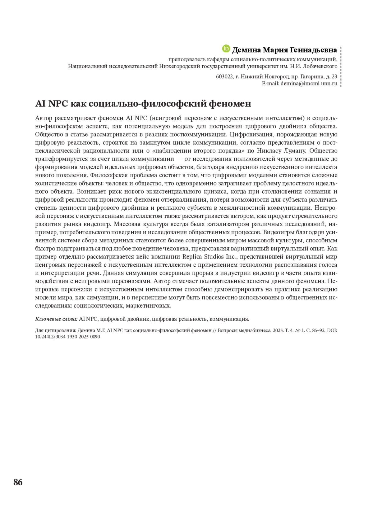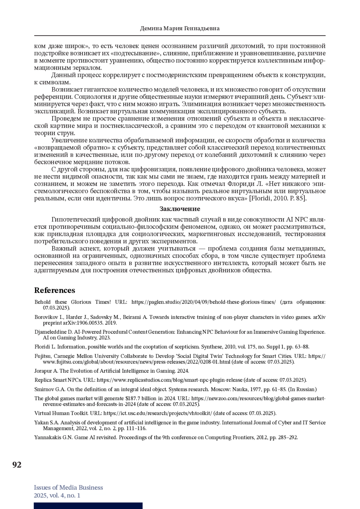 Автор рассматривает феномен AI NPC (неигровой персонаж с искусственным интеллектом) в социально-философском аспекте, как потенциальную модель для построения цифрового двойника общества. Общество в статье рассматривается в реалиях посткоммуникации. Цифровизация, порождающая новую цифровую реальность, строится на замкнутом цикле коммуникации, согласно представлениям о постнеклассической рациональности или о «наблюдении второго порядка» по Никласу Луману. Общество трансформируется за счет цикла коммуникации — от исследования пользователей через метаданные до формирования моделей идеальных цифровых объектов, благодаря внедрению искусственного интеллекта нового поколения. Философская проблема состоит в том, что цифровыми моделями становятся сложные холистические объекты: человек и общество, что одновременно затрагивает проблему целостного идеального объекта. Возникает риск нового экзистенциального кризиса, когда при столкновении сознания и цифровой реальности происходит феномен отзеркаливания, потери возможности для субъекта различать степень ценности цифрового двойника и реального субъекта в межличностной коммуникации. Неигровой персонаж с искусственным интеллектом также рассматривается автором, как продукт стремительного развития рынка видеоигр. Массовая культура всегда была катализатором различных исследований, например, потребительского поведения и исследования общественных процессов. Видеоигры благодаря усиленной системе сбора метаданных становятся более совершенным миром массовой культуры, способным быстро подстраиваться под любое поведение человека, предоставляя вариативный виртуальный опыт. Как пример отдельно рассматривается кейс компании Replica Studios Inc., представившей виртуальный мир неигровых персонажей с искусственным интеллектом с применением технологии распознавания голоса и интерпретации речи. Данная симуляция совершила прорыв в индустрии видеоигр в части опыта взаимодействия с неигровыми персонажами. Автор отмечает положительные аспекты данного феномена. Неигровые персонажи с искусственным интеллектом способны демонстрировать на практике реализацию модели мира, как симуляции, и в перспективе могут быть повсеместно использованы в общественных исследованиях: социологических, маркетинговых.
