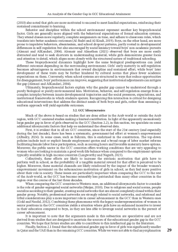 This paper investigates gender disparities in educational attainment across the Gulf Cooperation Council (GCC) countries using data from recent rounds of internationally benchmarked assessments (TIMSS and PIRLS). Contrary to global trends where boys typically outperform girls in mathematics and show parity in science, GCC countries exhibit a persistent and sizable gap favoring girls across grades and subjects, especially in science and language. The paper identifies a hump-shaped trajectory in the gap, peaking around 2015–2016 before narrowing slightly post-COVID. While Bahrain, Kuwait, Oman, and Saudi Arabia mirror the GCC average, Qatar and the UAE show smaller gaps and occasional reversals. Drawing on international literature and regional specificities, the paper explores biological, environmental, and biopsychosocial factors, as well as GCC-specific dynamics such as gendersegregated networks and women’s empowerment initiatives. The findings challenge dominant global narratives and call for targeted research and policy to address the potential long-term social and economic consequences of persistent male underachievement.