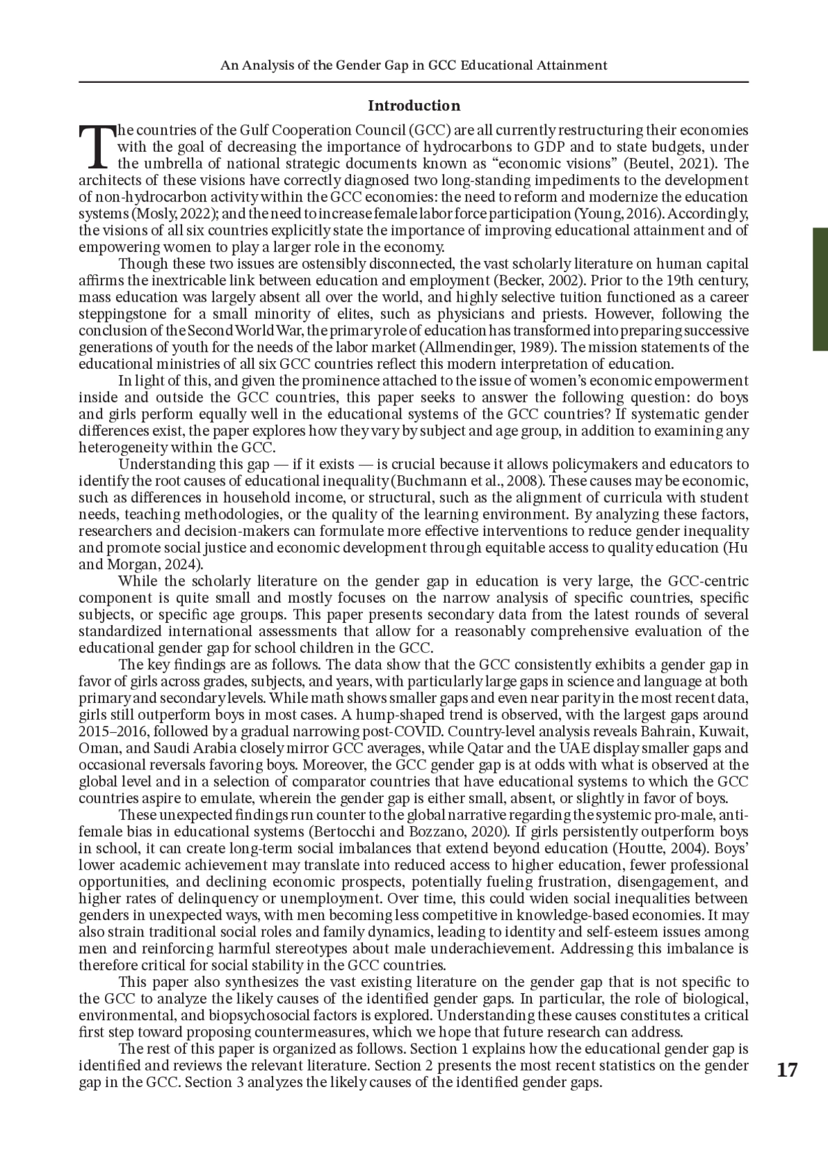 The countries of the Gulf Cooperation Council (GCC) are all currently restructuring their economies with the goal of decreasing the importance of hydrocarbons to GDP and to state budgets, under the umbrella of national strategic documents known as “economic visions” (Beutel, 2021). The architects of these visions have correctly diagnosed two long-standing impediments to the development of non-hydrocarbon activity within the GCC economies: the need to reform and modernize the education systems (Mosly, 2022); and the need to increase female labor force participation (Young, 2016). Accordingly, the visions of all six countries explicitly state the importance of improving educational attainment and of empowering women to play a larger role in the economy.