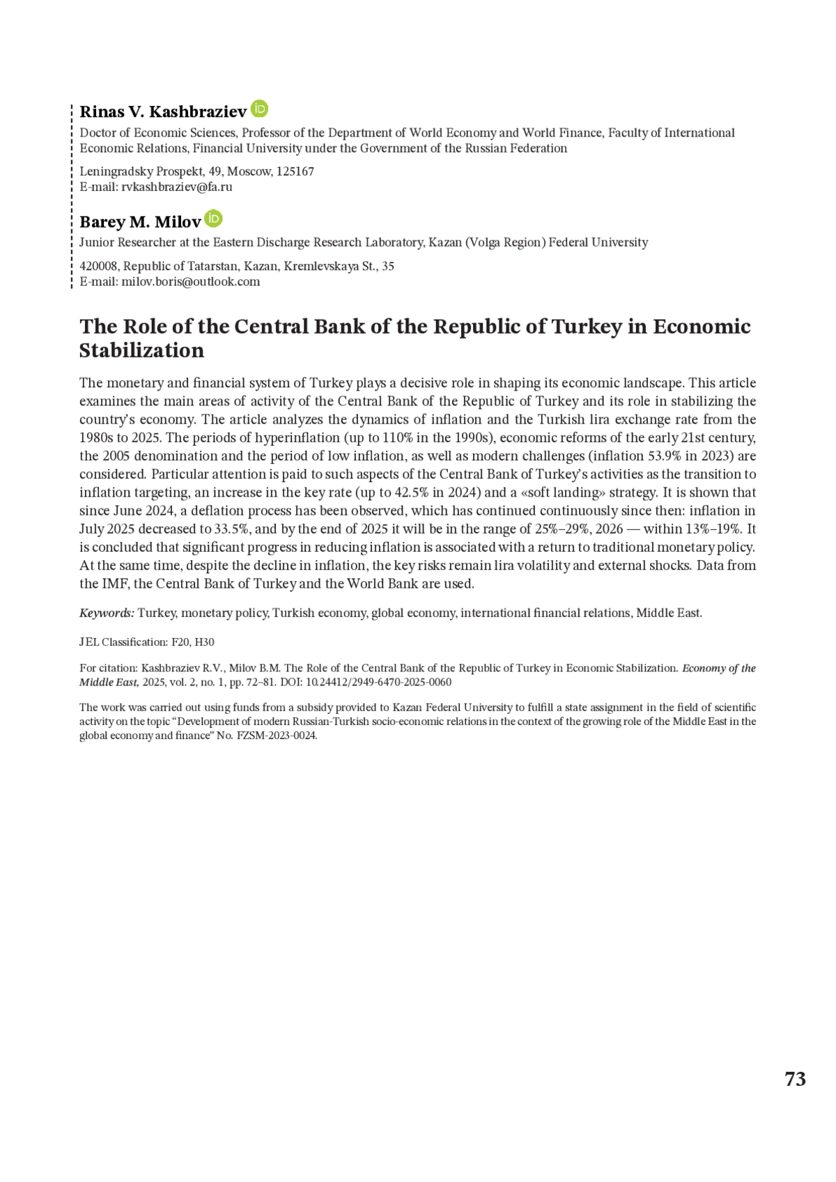 Валютно-финансовая система Турции играет решающую роль в формировании ее экономического ландшафта. В данной статье рассматриваются основные направления деятельности Центрального банка Турецкой Республики и его роль в стабилизации экономики страны. В статье анализируется динамика инфляции и курса турецкой лиры с 1980-х гг. до 2025 г. Рассматриваются периоды гиперинфляции (до 110% в 1990-х), экономические реформы начала XXI в., деноминация 2005 г. и период низкой инфляции, а также современные вызовы (инфляция 53,9% в 2023 г.). Особое внимание уделено таким аспектам деятельности Центрального банка Турции как переход к таргетированию инфляции, повышению ключевой ставки (до 42,5% в 2024 г.) и стратегии «мягкой посадки». Показано, что с июня 2024 г. наблюдается процесс дефляции, который с тех пор продолжается непрерывно: инфляция в июле 2025 г. снизилась до 33,5%, а к концу 2025 г. будет находиться в диапазоне 25%–29%, 2026 г. — в пределах 13%–19%. Сделан вывод о том, что значительный прогресс в снижении инфляции связан с возвращением к традиционной денежно-кредитной политике. Вместе с тем, несмотря на снижение инфляции, ключевыми рисками остаются волатильность лиры и внешние шоки. Использованы данные МВФ, Центрального банка Турции и Всемирного банка.