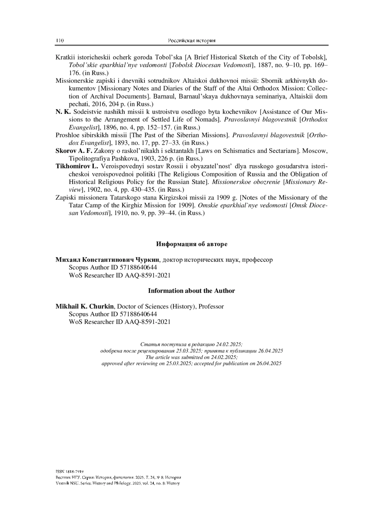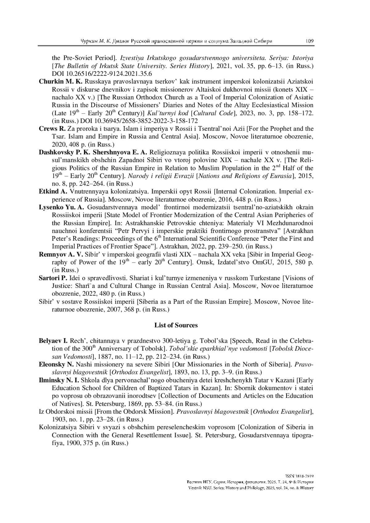 9. Чуркин М. К. Русская православная церковь как инструмент имперской колонизации Азиатской России в дискурсе дневников и записок миссионеров Алтайской духовной миссии (конец ХIХ - начало ХХ в.) // Культурный код. 2023. № 3. С. 158-172. https://doi.org/10.36945/2658-3852-2022-3-158-172