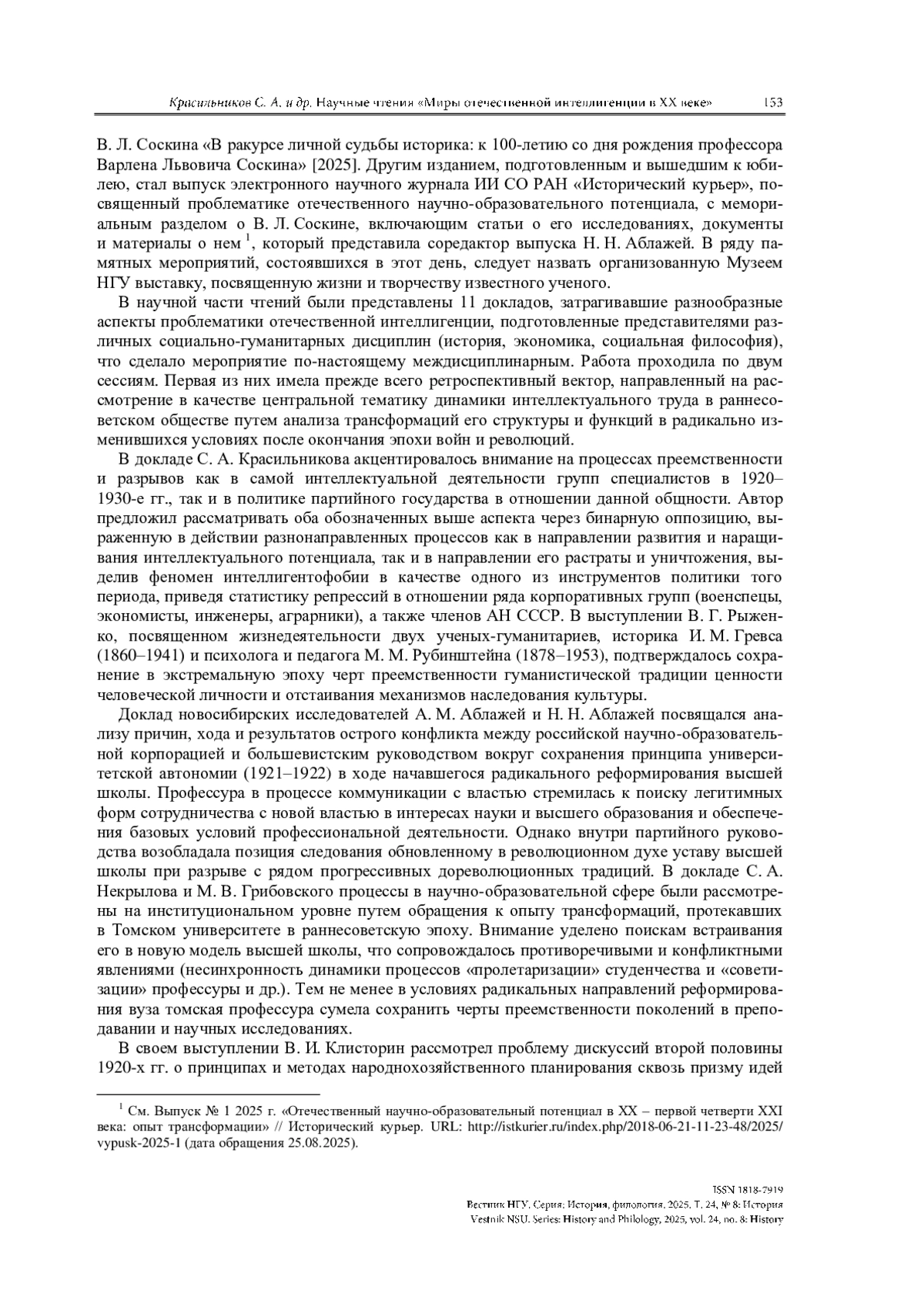 Представлен отчет о Научных чтениях «Миры отечественной интеллигенции в XX веке: профессия, общество, власть», проходивших на базе Новосибирского государственного университета 26 февраля 2025 г. Мероприятие было посвящено 100-летию со дня рождения исследователя культуры и интеллигенции советской эпохи, доктора исторических наук, профессора Варлена Львовича Соскина.