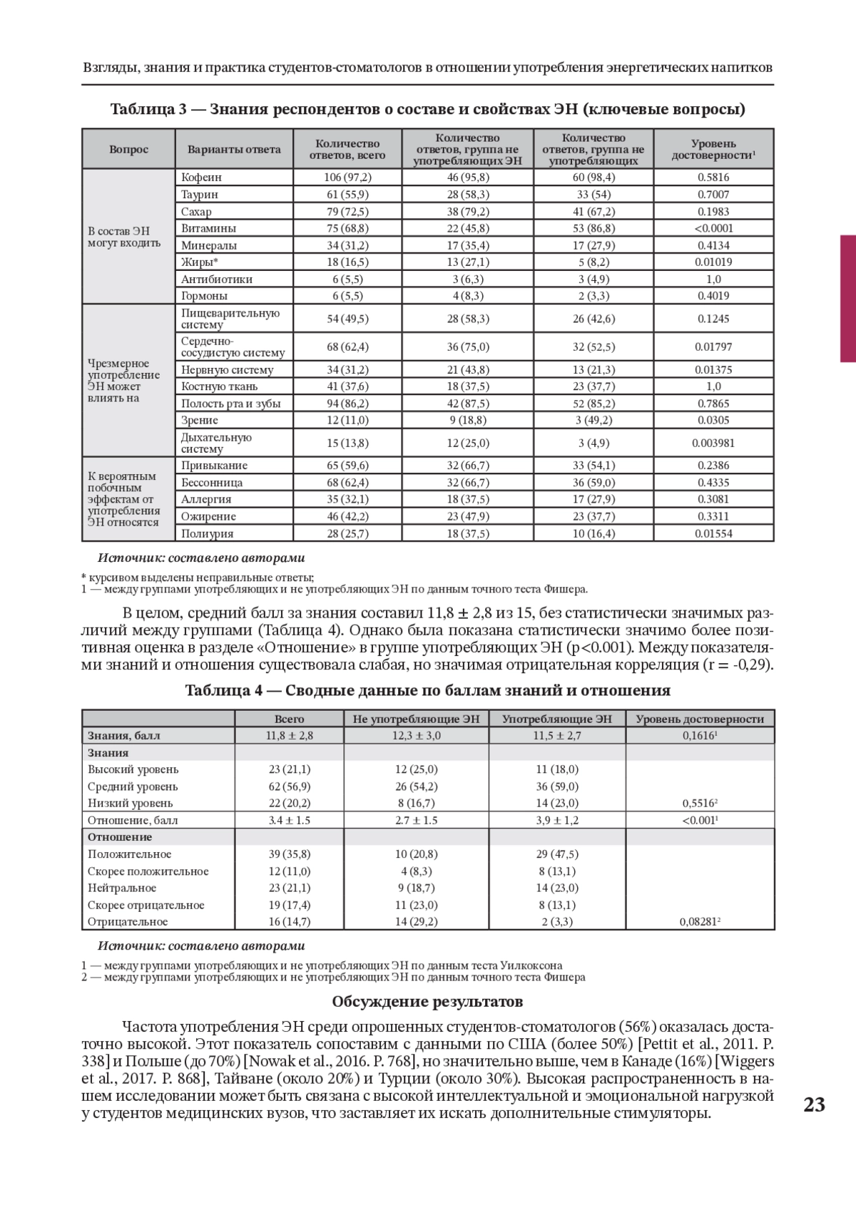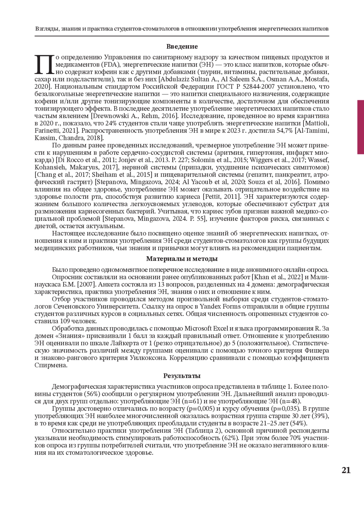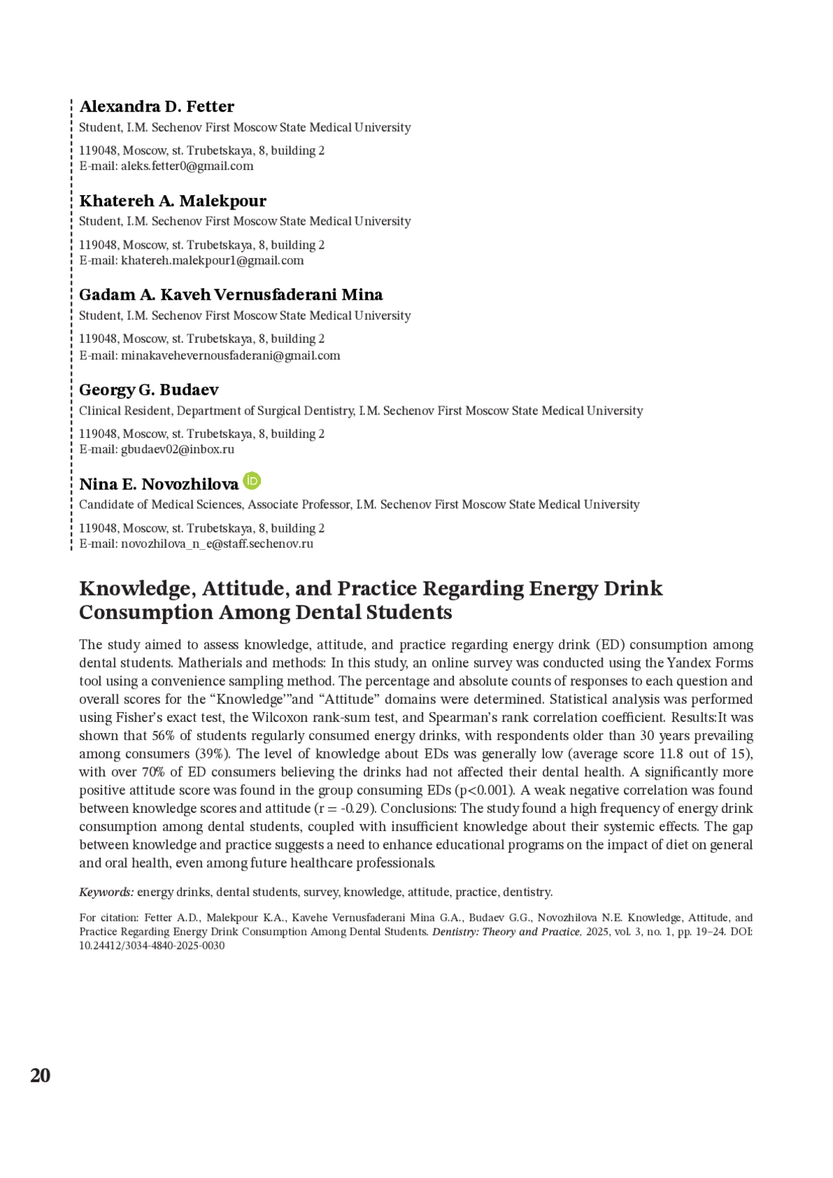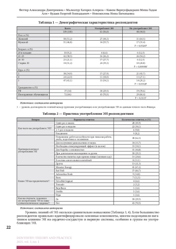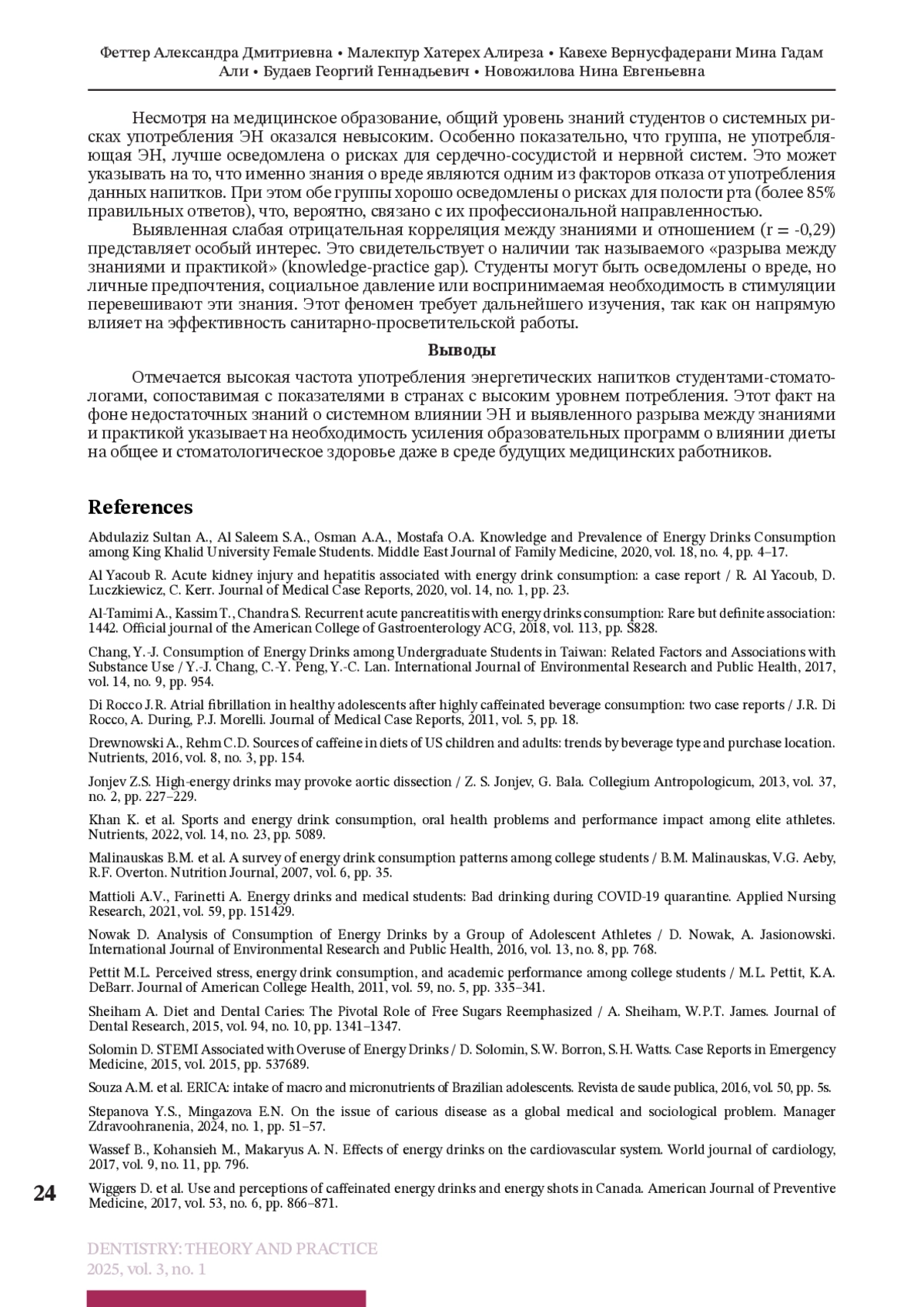 Целью исследования была оценка знаний об энергетических напитках (ЭН), отношения к ним и практики их употребления среди студентов-стоматологов. Материалы и методы: в настоящем исследовании проводился онлайн-опрос с помощью инструмента Yandex forms методом произвольной выборки. Определяли процент и абсолютное количество ответов на каждый вопрос, а также общие баллы за домены «Знания» и «Отношение». Статистическую обработку проводили с помощью точного критерия Фишера, критерия Уилкоксона и коэффициента корреляции Спирмена. Результаты: Было показано, что 56% студентов регулярно употребляли энергетические напитки, причем среди употребляющих преобладали респонденты старше 30 лет (39%). Уровень знаний об ЭН оказался в целом невысоким (средний балл 11,8 из 15), при этом более 70% потребителей ЭН не считали, что напитки повлияли на их стоматологическое здоровье. Выявлен статистически значимо более высокий балл за отношение к ЭН в группе употребляющих напитки (p<0.001). Установлена слабая отрицательная корреляция между уровнем знаний и отношением к ЭН (r = -0,29). Выводы: Отмечается высокая частота употребления энергетических напитков студентами-стоматологами на фоне недостаточных знаний об их системном влиянии. Наличие разрыва между знаниями и практикой указывает на необходимость усиления образовательных программ о влиянии диеты на общее и стоматологическое здоровье даже в среде будущих медицинских работников.