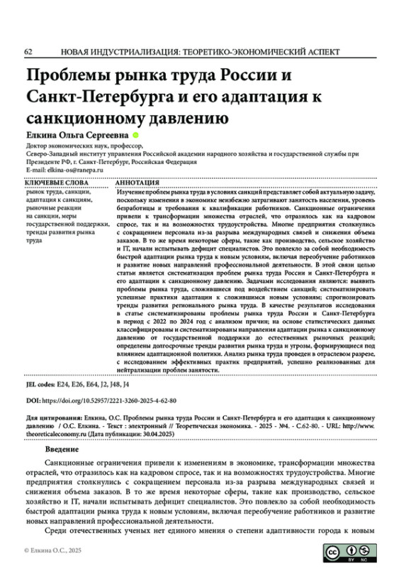 Изучение проблем рынка труда в условиях санкций представляет собой актуальную задачу, поскольку изменения в экономике неизбежно затрагивают занятость населения, уровень безработицы и требования к квалификации работников. Санкционные ограничения привели к трансформации множества отраслей, что отразилось как на кадровом спросе, так и на возможностях трудоустройства. Многие предприятия столкнулись с сокращением персонала из-за разрыва международных связей и снижения объема заказов. В то же время некоторые сферы, такие как производство, сельское хозяйство и IT, начали испытывать дефицит специалистов. Это повлекло за собой необходимость быстрой адаптации рынка труда к новым условиям, включая переобучение работников и развитие новых направлений профессиональной деятельности. В этой связи целью статьи является систематизация проблем рынка труда России и Санкт-Петербурга и его адаптации к санкционному давлению. Задачами исследования являются: выявить проблемы рынка труда, сложившиеся под воздействием санкций; систематизировать успешные практики адаптации к сложившимся новым условиям; спрогнозировать тренды развития регионального рынка труда. В качестве результатов исследования в статье систематизированы проблемы рынка труда России и Санкт-Петербурга в период с 2022 по 2024 год с анализом причин; на основе статистических данных классифицированы и систематизированы направления адаптации рынка к санкционному давлению от государственной поддержки до естественных рыночных реакций; определены долгосрочные тренды развития рынка труда и угрозы, формирующиеся под влиянием адаптационной политики. Анализ рынка труда проведен в отраслевом разрезе, с исследованием эффективных практик предприятий, успешно реализованных для нейтрализации проблем занятости.