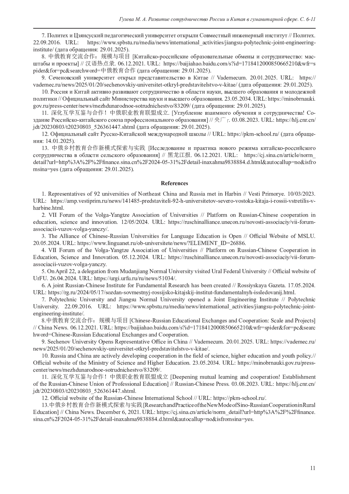 13. 中俄乡村教育合作新模式探索与实践 [Исследование и практика нового режима китайско-российского сотрудничества в области сельского образования] // 黑龙江报. 06.12.2021. URL: https://cj.sina.cn/article/norm_detail?url=http://finance.sina.cn/2024-05-31/detail-inaxahma9838884.d.html&autocallup=no&isfromsina=yes (дата обращения: 29.01.2025).