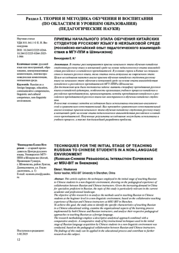 Целью исследования является анализ приемов обучения китайских студентов русскому языку на начальном этапе обучения в неязыковой среде на основе опыта взаимодействия китайского и российского преподавателей МГУ-ППИ в Шэньчжэне.