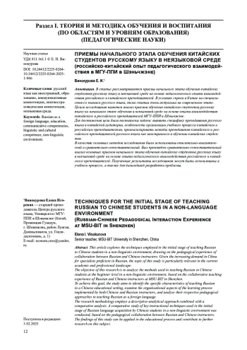 В статье рассматриваются приемы начального этапа обучения китайских студентов русскому языку в неязыковой среде на основе педагогического опыта взаимодействия российского и китайского преподавателей. В условиях спроса в Китае на специалистов со знанием русского языка, тема статьи очень актуальна на современном этапе.