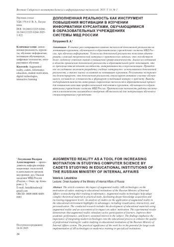 В статье рассматривается влияние технологий дополненной реальности на мотивацию курсантов, обучающихся в образовательных учреждениях системы МВД России, при обучении информатике. Технологии дополненной реальности помогают адаптировать сложный теоретический материал к практическим задачам, что способствует более глубокому усвоению знаний и повышению уровня вовлеченности. Анализ исследований в области применения дополненной реальности в образовательной среде показывает, что ее преимущества включают наглядность, интерактивность и персонализацию. Проведенное исследование включает разработку учебных материалов с использованием дополненной реальности, а также оценку их влияния на мотивацию курсантов. Результаты эксперимента демонстрируют, что дополненная реальность стимулирует активное участие обучающихся, улучшает их успеваемость и формирует устойчивый интерес к предмету. Выводы подчеркивают важность интеграции современных технологий в образовательный процесс для повышения качества профессиональной подготовки курсантов, обучающихся в образовательных учреждениях системы МВД России. Практическая значимость работы заключается в возможности масштабного внедрения AR-технологий для модернизации обучения в специализированных учреждениях.