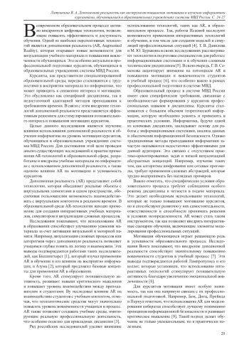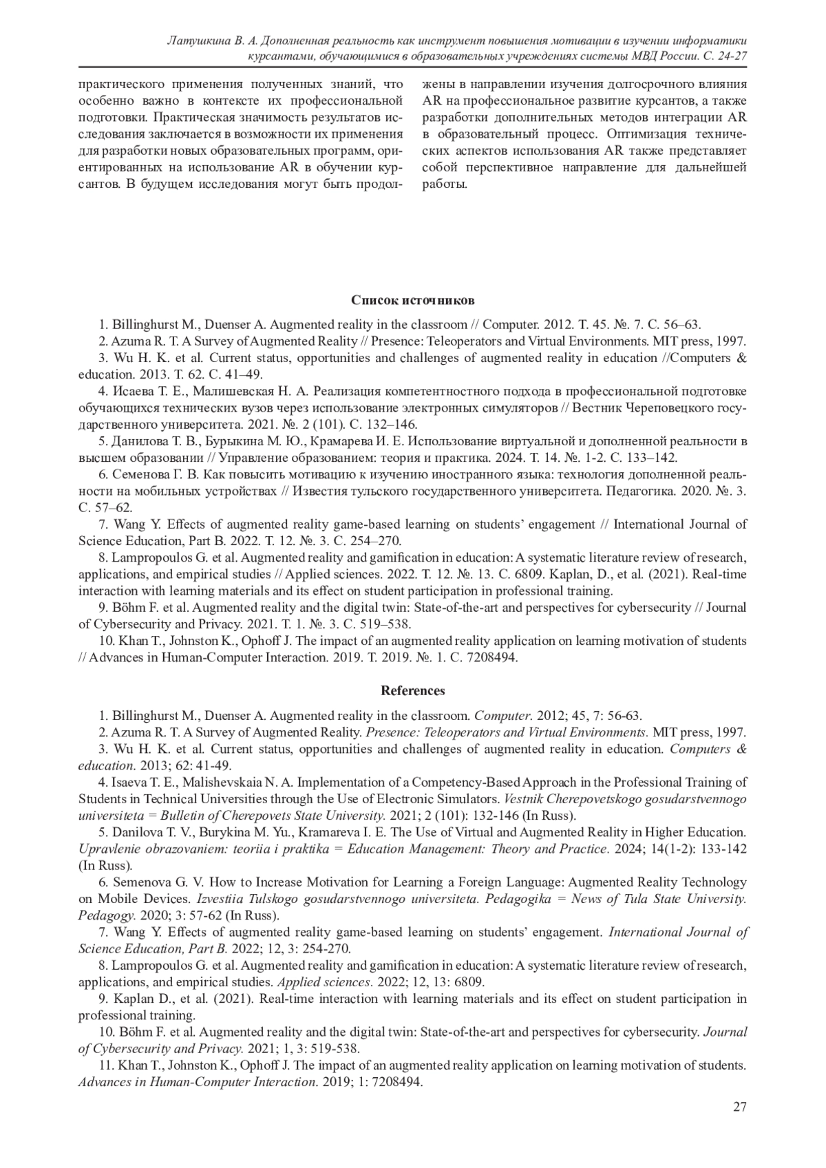 5. Данилова Т. В., Бурыкина М. Ю., Крамарева И. Е. Использование виртуальной и дополненной реальности в высшем образовании // Управление образованием: теория и практика. 2024. Т. 14. №. 1-2. С. 133-142.