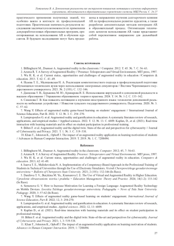 1. Billinghurst M., Duenser A. Augmented reality in the classroom // Computer. 2012. Т. 45. №. 7. С. 56-63.