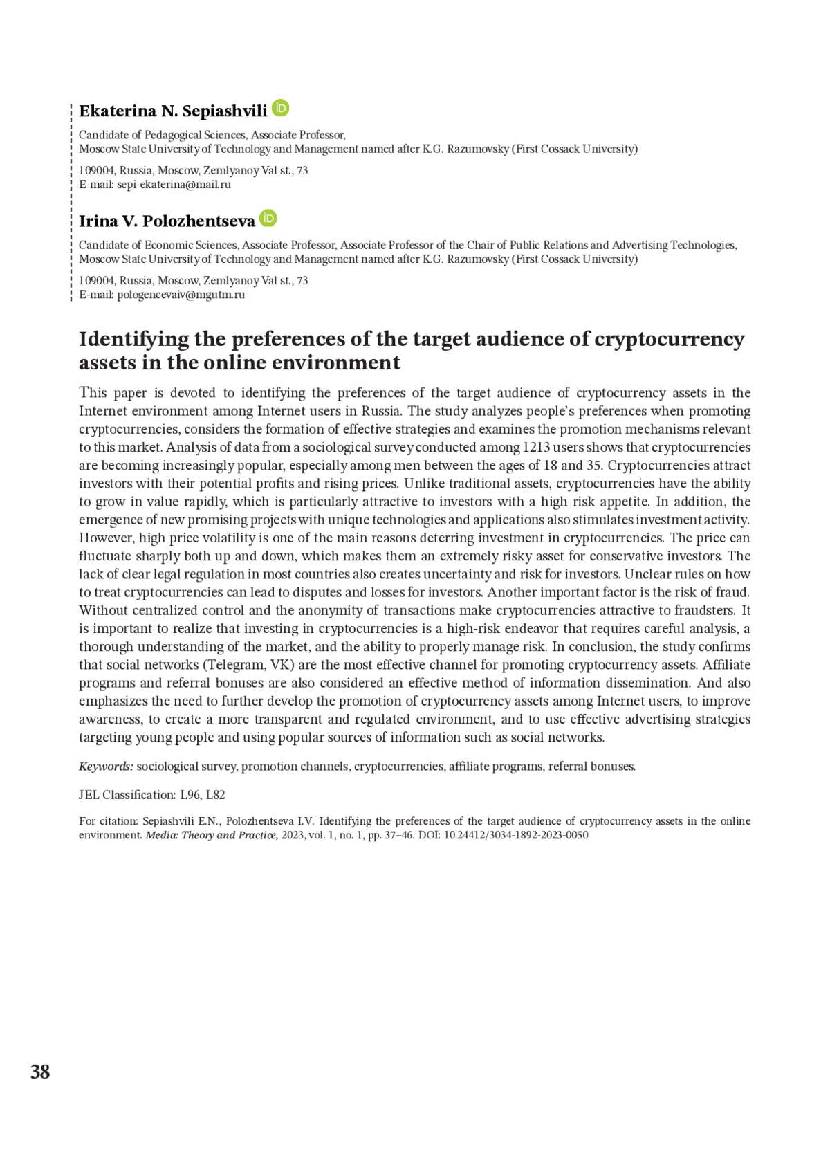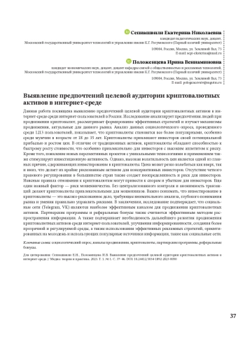 Данная работа посвящена выявлению предпочтений целевой аудитории криптовалютных активов в интернет-среде среди интернет-пользователей в России. Исследование анализирует предпочтения людей при продвижении криптовалют, рассматривает формирование эффективных стратегий и изучает механизмы продвижения, актуальные для данного рынка. Анализ данных социологического опроса, проведенного среди 1213 пользователей, показывает, что криптовалюты становятся все более популярными, особенно среди мужчин в возрасте от 18 до 35 лет. Криптовалюты привлекают инвесторов своей потенциальной прибылью и ростом цен. В отличие от традиционных активов, криптовалюты обладают способностью к быстрому росту стоимости, что особенно привлекательно для инвесторов с высоким аппетитом к риску. Кроме того, появление новых перспективных проектов с уникальными технологиями и применением также стимулирует инвестиционную активность. Однако, высокая волатильность цен является одной из главных причин, сдерживающих инвестирование в криптовалюты. Цена может резко колебаться как вверх, так и вниз, что делает их крайне рискованным активом для консервативных инвесторов. Отсутствие четкого правового регулирования в большинстве стран также создает неопределенность и риск для инвесторов. Неясные правила отношения к криптовалютам могут привести к спорам и убыткам для инвесторов. Еще один важный фактор — риск мошенничества. Без централизованного контроля и анонимность транзакций делают криптовалюты привлекательными для мошенников. Важно понимать, что инвестирование в криптовалюты — это высоко-рискованное дело, требующее внимательного анализа, глубокого понимания рынка и умения правильно управлять рисками. В заключении, исследование подтверждает, что социальные сети (Telegram, VK) являются наиболее эффективным каналом для продвижения криптовалютных активов. Партнерские программы и реферальные бонусы также считаются эффективным методом распространения информации. А также подчеркивает необходимость дальнейшего развития продвижения криптовалютных активов среди интернет-пользователей, улучшения информированности, создания более прозрачной и регулируемой среды, а также использования эффективных рекламных стратегий, ориентированных на молодежь и использующих популярные источники информации, такие как социальные сети.