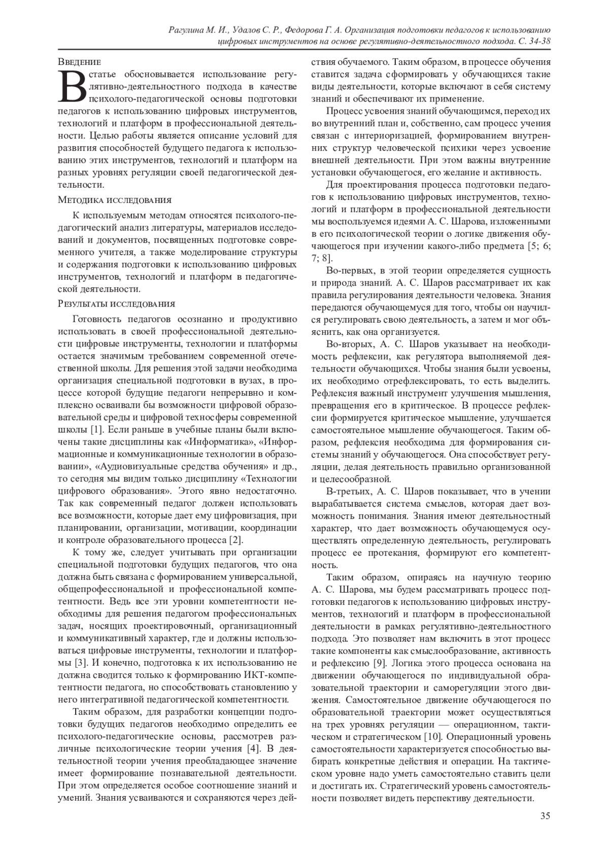 В статье обосновывается использование регулятивно-деятельностного подхода в качестве психолого-педагогической основы подготовки педагогов к использованию цифровых инструментов, технологий и платформ в профессиональной деятельности. Целью работы является описание условий для развития способностей будущего педагога к использованию этих инструментов, технологий и платформ на разных уровнях регуляции своей педагогической деятельности. К используемым методам относятся психолого-педагогический анализ литературы, материалов исследований и документов, посвященных подготовке современного учителя, а также моделирование структуры и содержания подготовки к использованию цифровых инструментов, технологий и платформ в педагогической деятельности. Результатом работы является описание процесса подготовки педагогов к использованию цифровых инструментов, технологий и платформ как трехэтапного движения будущего педагога по индивидуальной образовательной траектории и саморегуляции им этого движения. Полученные результаты могут быть применены для разработки методической системы подготовки педагогов к использованию цифровых инструментов, технологий и платформ в профессиональной деятельности. Авторы статьи пришли к выводу, что использование регулятивно-деятельностного подхода позволяет строить процесс подготовки педагогов к использованию цифровых инструментов, технологий и платформ в профессиональной деятельности так, чтобы направить его на формирование у студентов профессиональной компетенции и последовательно вывести их на операционный, тактический и стратегический уровень регуляции педагогической деятельности.