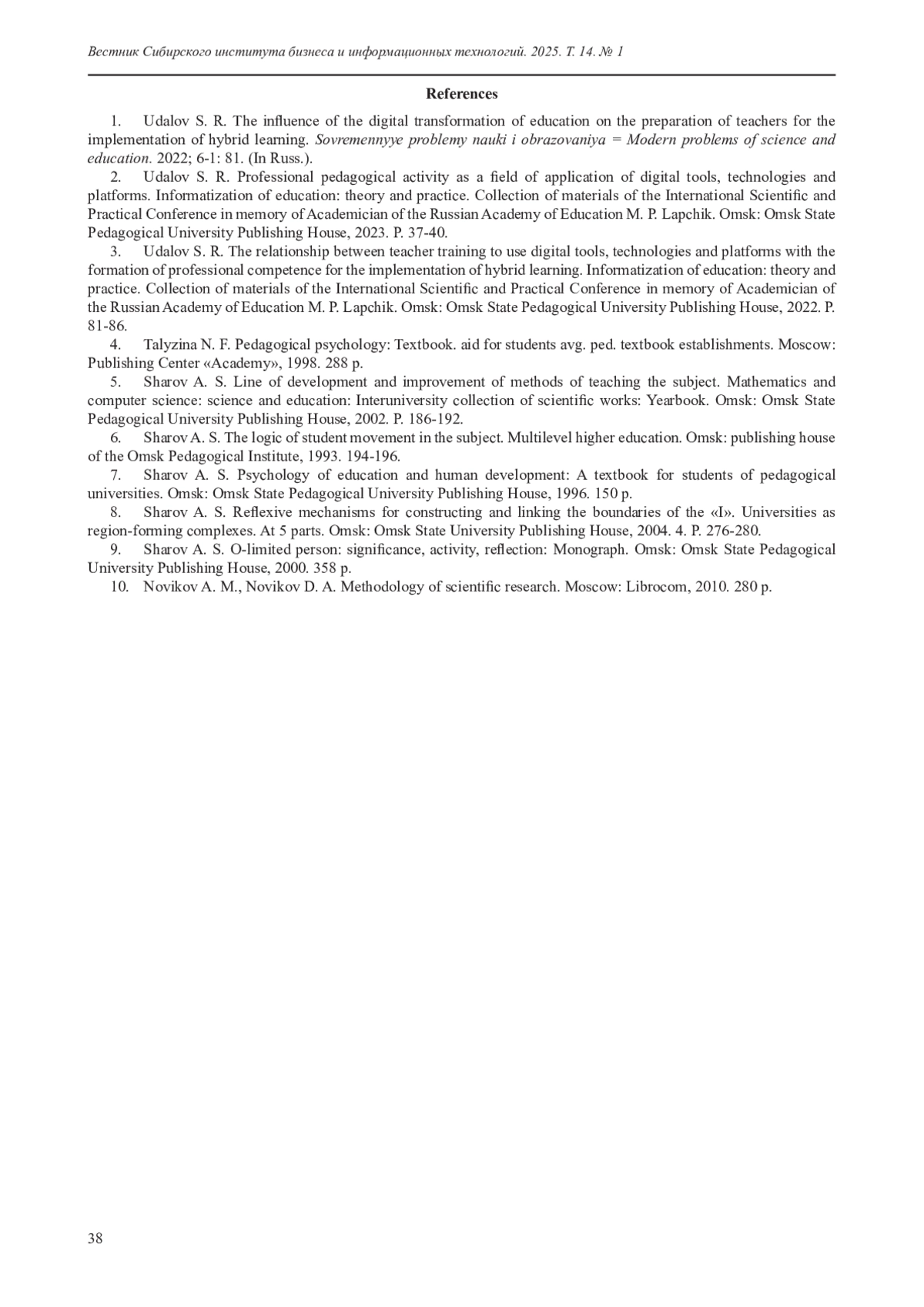 1. Удалов С. Р. Влияние цифровой трансформации образования на подготовку педагогов к реализации гибридного обучения // Современные проблемы науки и образования. 2022. № 6-1. С. 81.